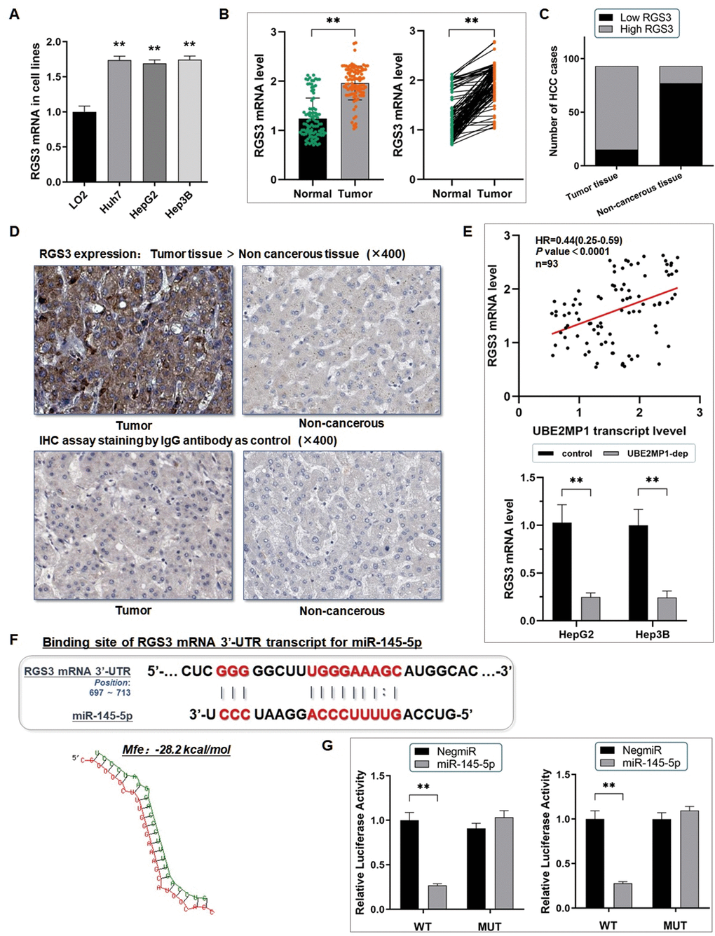 Interestingly, we occasionally noticed that RGS3 is highly expressed in both HCC cell lines and HCC tissues (Figure 5A–5D). And notably, RGS3 shared a positively correlated with UBE2MP1 expression in the HCC tissues from our center, and the expression of RGS3 presented a remarkable decrease in HCC cells when UBE2MP1 was depleted (Figure 5E). We wondered if there exists a co-expression or regulation between UBE2MP1 and RGS3. On basis of this point, we tried to explore the role that miR-145-5p plays in this axis. The microcosm an online prediction software (https://www.microcosm.com/) indicated that miR-145-5p was an upstream regulator potentially interacting with the 3’-untranslated region (3’-UTR) of RGS3 mRNA with a high recommendation (Mfe: -28.2 kcal/mol) (Figure 5F). The dual-luciferase reporter assay was used for validating this assumpted direct binding between miR-145-5p and RGS3 mRNA. Similar to the above technique, we constructed the vectors containing a 202 bp sequence intercepted from the 3'UTR from the RGS3 mRNA (WT-UTR), and also the control luciferase vectors containing a mutated miR-145-5p targeting site (MUT-UTR). Both HepG2 and Hep3B cells were transfected with either the above two kinds of vectors and also mimicked by miR-145-5p. Here, taking HepG2 cells, for example, the miR-145-5p mimics (HepG2/miR-145-5p) significantly defected the luciferase signal of RGS3/pMIR/WT in comparison with the negative control (HepG2/NigmiR). The signal suppressive effect induced by miR-145-5p was abrogated in HepG2 cells transfected with a mutated miR-145-5p binding site (Figure 5G). And similar results were obtained from the Hep3B cell line too.