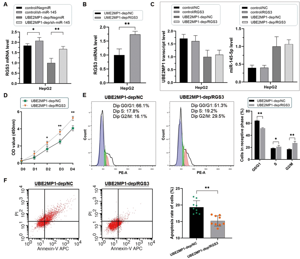 Since the verification of the post-transcriptional degeneration effect of miR-145-5p on RGS3 mRNA, we prompt that the phenotypes induced by UBE2MP1 in HCC are due to the modulation of the potential miR-145-5p/RGS3 axis. Take HepG2 cells as an example, firstly we lower the miR-145-5p expression in HepG2 cells treated with UBE2MP1 depletion again (Figure 6A). The suppressed cell proliferation was significantly recovered along with the escape of G0/G1 stage arrest (Figure 6B, 6C). Simultaneously, the number of apoptotic cells was decreased (Figure 6D). Secondly, we re-introduced RGS3, which had been down-regulated through UBE2MP1 depletion, in HepG2 cells. As expected, the knock-down of miR-145-5p led to an obvious increase in RGS3 expression at both mRNA and protein stages (Figure 7A). Interestingly, even though the expression of either UBE2MP1 or miR-145-5p was not impacted by re-introducing RGS3 in HCC cells, the cell proliferation and apoptosis statuses induced by UBE2MP1 depletion were effectively recovered RGS3 (Figure 7B–7F).