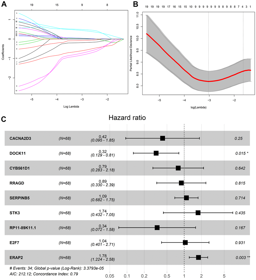 Next, we excluded OR2B2 for its barely expression, and finally 19 genes entered the variable selection of the model. Additionally, we utilized Lasso algorithm to screen out the independent variables. 1000 models were calculated by setting the parameter nlambda = 1000, and the coefficients of independent variables were obtained (Figure 1A). Besides, we filtered the lambda value (λ value) through 10-fold cross-validation, and obtained two models. It should be mentioned that one model was based on lambda.min (the error mean is the minimum corresponding lambda, dotted line on the left); the other was based on lambda.1se (the maximum lambda of the error mean within 1 standard deviation of the minimum value, dotted line on the right). As shown in Figure 1B, we adopted 9 genes as model variables for model construction. After determining the model variables, we employed the R package survival to construct the multi-factor Cox risk ratio model for these 9 genes, and identified the final model, which included the coefficients, risk values, and P values of each variable. Meanwhile, the coefficients of the best model of Lasso were also shown (Table 3). We adopted R package to plot the Forest plot of this model, and found that the P values of ERAP2 and DOCK11 were both less than 0.05, suggesting that they could be independent prognostic factors for pancreatic cancer patients treated with gemcitabine, respectively (Figure 1C). Moreover, we proved the Concordance Index of this model reaches 0.79, indicating that the model is accurate and reliable.