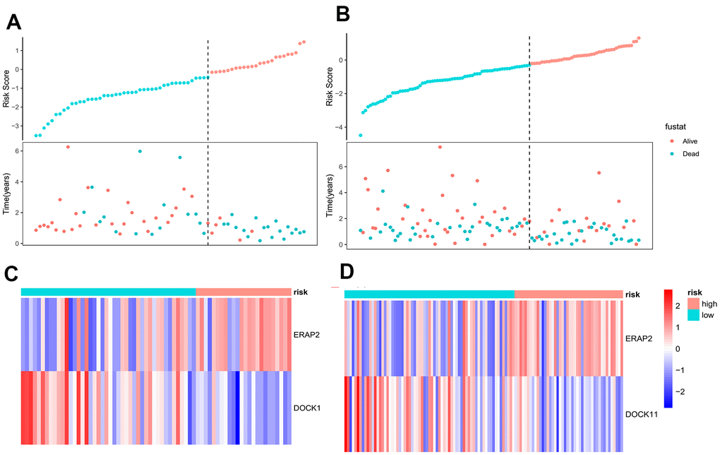 To further illustrate the validity of the Lasso-Cox regression model, we described the survival time and survival status of patients by a risk factor correlation diagram as their risk values changed. First of all, patients were assigned to high-risk group and low-risk group with cut off value equal to -0.3 (dotted line in the middle), which was calculated by Xtile software. We also mapped the distribution of survival time and status in pancreatic cancer patients based on the distribution of risk values. Patients in the high-risk group of the model group and the validation group showed shorter survival time and lower survival rates compared with the lower risk group (Figure 2A, 2B). We found ERAP2 and DOCK11 were important independent prognostic factors, and the relationship between their expression levels and risk values was also analyzed. As shown in the heat map, ERAP2 expression as a risk factor was higher in the high-risk group, while DOCK11 expression as a protective factor was lower in the low-risk group. The trend of model group and validation group is consistent, indicating a strong universality of the model (Figure 2C, 2D).