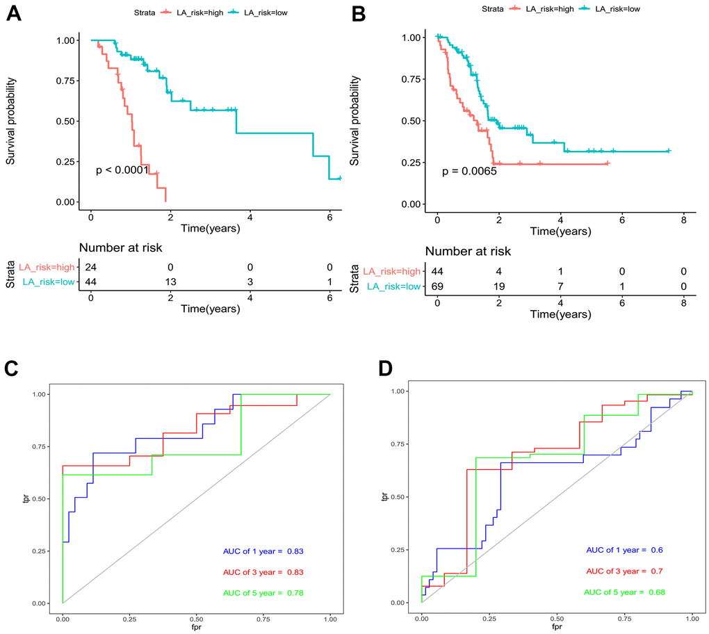 According to the variable coefficients of the optimal model of Lasso regression mentioned above (Table 3), the Lasso regression coefficients corresponding to 9 genes were obtained. Then we obtained the Risk Score of each pancreatic cancer patient according to the expression levels of 9 genes, and obtained the value of risk for 68 pancreatic cancer patients with gemcitabine treatment. After calculating the cut off value by Xtile software, patients with a risk value above -0.3 were considered to be in the high-risk group, while the rest were considered to be in the low-risk group. The corresponding Kaplan-Meier survival curve was shown in Figure 3A. At the same time, 113 pancreatic cancer patients without gemcitabine medication information were applied to validate the model. Similarly, the risk value of each patient was calculated by the expression levels of 9 genes, and the corresponding Kaplan-Meier survival curve was plotted (Figure 3B). It was obvious that the prognosis of low-risk patients in the model group (n = 68) and validation group (n = 113) was better than that of high-risk patients. We further draw the ROC curves of the prediction results of the model group and the validation group, and the 1-, 3- and 5-year ROC curves of pancreatic cancer patients, respectively. In the model group, the 1-, 3- and 5-year AUC area was 0.83, 0.83, and 0.76, respectively, indicating the good predictive ability on the survival of pancreatic cancer patients treated with gemcitabine of the model, and we observed that the Lasso-Cox regression model composed of these 9 genes had a very high accuracy (Figure 3C). In the validation group, the 1-, 3- and 5-year AUC areas were 0.6, 0.7 and 0.68, respectively. In the case of using external data, the model still maintained a high accuracy, indicating that the Lasso-Cox regression model constituted by these 9 genes had good universality (Figure 3D).