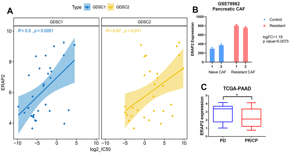In this study, we employed the drug sensitivity data in GDSC combined with TCGA database to identify Endoplasmic Reticulum Aminopeptidase 2 (ERAP2) as the key gene associated with cellular gemcitabine sensitivity and patient prognosis, providing a new option for adjuvant gemcitabine chemotherapy for pancreatic cancer.