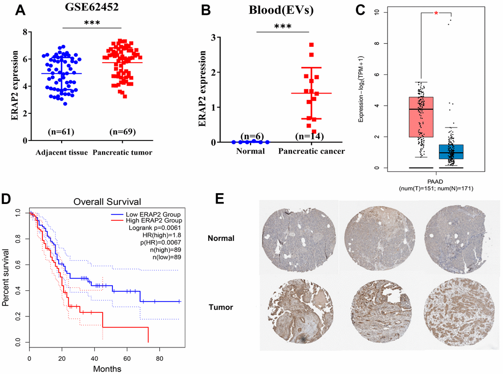 The above findings show that ERAP2 is a key gene affecting gemcitabine resistance in patients with pancreatic cancer, which enable us to further study whether there is a relationship between ERAP2 and the diagnosis and prognosis of pancreatic cancer. We downloaded the expression microarray GSE62452 from GEO database of pancreatic tumors and paracancerous tumors, and found that ERAP2 was highly expressed in pancreatic tumors (Figure 5A). In addition, ERAP2 was also significantly overexpressed in blood extracellular vesicle samples of pancreatic cancer patients from the BBCancer database (Figure 5B). Next, we analyzed the ERAP2 expression in pancreatic cancer by the GEPIA database and found that ERAP2 was significantly overexpressed in pancreatic cancer samples, which further demonstrated the cancer-promoting effect of ERAP2 (Figure 5C). In addition, we performed a Kaplan-Meier survival analysis in the TCGA pancreatic cancer dataset, using the median expression of ERAP2 as the threshold. The results are consistent with previous analysis, indicating that high ERAP2 expression is a risk factor for poor prognosis (Figure 5D), while DOCK11 failed to differentiate patient prognosis (Supplementary Figure 1). Finally, we adopted the immunohistochemical data of pancreatic tissues and pancreatic tumors in ProteinAtlas database to verify the expression of the protein level of ERAP2, and further confirmed the high expression of ERAP2 in pancreatic tumor (Figure 5E). The above results suggest that ERAP2 is overexpressed in pancreatic cancer, resulting in a poor prognosis.