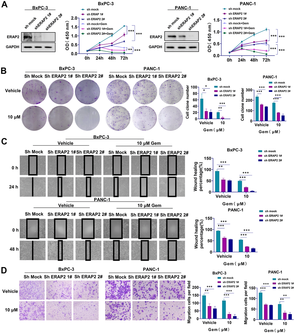We next identified the tumorigenesis and sensitivity of pancreatic cancer cells to gemcitabine after ERAP2 knockdown. It was indicated that ERAP2 knockdown significantly restrained the growth of pancreatic cancer cells (Figure 7A, 7B). Interestingly, ERAP2 knockdown also significantly increased sensitivity to gemcitabine in these two pancreatic cancer cell lines (Figure 7A, 7B). We also tested the effects of ERAP2 on cell migration and invasion by wound healing assay and Transwell invasion assay. As suggested in Figure 7C, 7D, knockdown of ERAP2 remarkably attenuated the migration ability of pancreatic cancer cell lines, and the invasion ability of pancreatic cancer cell lines was also inhibited. Compared with gemcitabine alone, knockdown ERAP2 combined with gemcitabine further reduced the migration ability of pancreatic cancer cells, and the invasion ability was more significantly inhibited (Figure 7C, 7D). Overall, our results suggest that down-regulation of ERAP2 significantly blocks the tumorigenic ability of pancreatic cancer cells and significantly enhances the anti-pancreatic cancer activity of gemcitabine.