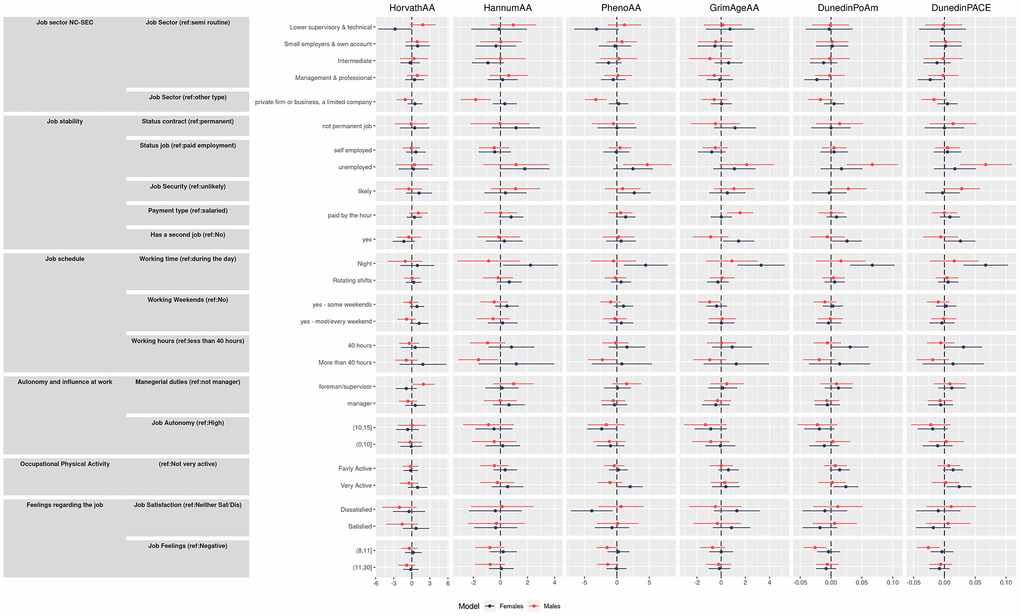 For each job characteristics, we fitted linear regression models to evaluate the association of the epigenetic clocks and pace of aging with known health risk factors and work characteristics. We estimated unadjusted and fully adjusted models (adjustment was made for sex, alcohol consumption, smoking, BMI and educational level). Age was not adjusted for because chronological age has zero correlation with age acceleration measures (by definition). Results are reported as point estimates and 95% confidence intervals. The estimates are interpretable as years of increase/decrease for epigenetic age; positive coefficients indicate age acceleration, and negative coefficients indicate a decrease of the estimated biological age compared to the chronological age. For the pace of ageing marker, the rate indicates the percentage of biological aging increase compared to the reference category. We expect that job indicators on the well-being side should have negative or at least null estimated coefficients, while indicators of adverse working conditions would present positive estimates. We estimated sex-specific fully adjusted linear regression models as a sensitivity analysis. We assessed linear regression assumptions on residual analysis. The clocks have different standard deviations, therefore is not possible to compare the results by standardizing the estimated effects. Given the descriptive and exploratory approach, we abstained from p-value adjustments to correct for multiple testing.