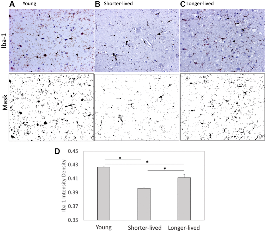 This study has limitations due to the small number of animals. Moreover, the differences between elderly groups could be linked to clinical observations leading to necropsy and to post-mortem findings. For instance, long-lived animals had compromised bones and joints, and internal adhesions, but did not have tumors, diabetes or signs of metabolic disorders, which were rather found in the shorter-lived elderly group. Thus, microglial loss could also result from systemic disease more frequently observed in shorter-lived animals. Age-matching controls, particularly to the shorter-lived animals’ group was not available, limiting conclusions. Yet, it is unlikely that the loss of microglia is just a transient age-effect, while the maintenance of microglia numbers in animals that lived longer suggests this may be a hallmark of healthy aging. The correlation between microglia and age was striking, suggesting that supporting this population may be critical to longevity.