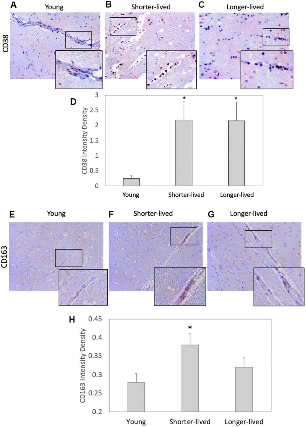 CD38 is a marker of immune activation and a NAD limiting factor. We found an effect of age on the expression of CD38 measured by IHC on PFC sections (F2,12=4.995, p=0.0347). This marker expressed at higher levels in all elder animals compared to young controls (Figure 2D). Young animals had few CD38+ cells associated with vessels and few diffuse in the parenchyma (Figure 2A). Although the two elder groups expressed similar CD38 intensity levels (p=0.998), which were higher than young (p=0.05), distribution patterns differed significantly between them (Figure 2B–2D). In shorter-lived elders, CD38+ cells were strongly stained and were mostly clustered in perivascular foci, associated with signs of edema and tissue damage. On the other hand, in longer-lived animals these cells were diffuse, some perivascular, but no severe pathology. CD163 expression in myeloid cells characterizes response to inflammation and was restricted to the perivascular domain (Figure 2E–2G). Although blood vessels were enlarged in both elder groups, shorter-lived animals had significantly more detectable CD38+ cells compared to young, while in longer-lived animals the increase was not significantly different from the other groups (Figures 2H).