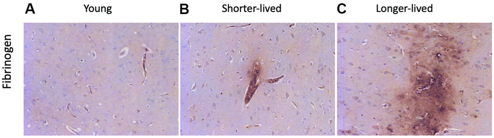 The loss of integrity of the BBB is a critical component of aging, which can be detectable in tissue sections by the staining against fibrinogen, which is normally maintained within blood vessels by strong endothelial junctions [45]. Fibrinogen staining marked the microvasculature and, when found in the extravascular space, it indicated loss of BBB integrity and leaks (Figure 3). In both elder groups, extravascular fibrinogen was occasionally detected, showing leaks from blood vessels to the brain tissue (Figure 3B, 3C). Larger leaks were observed in the longer-lived group (Figure 3C), compared to the shorter-lived group (Figure 3B).