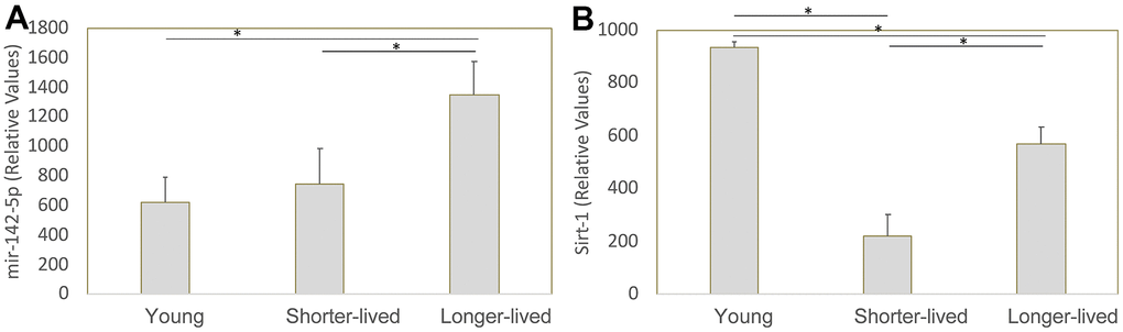 Mir-142-5p increased with age while Sirt1 transcription decreased in PFC of long-lived aged animals
