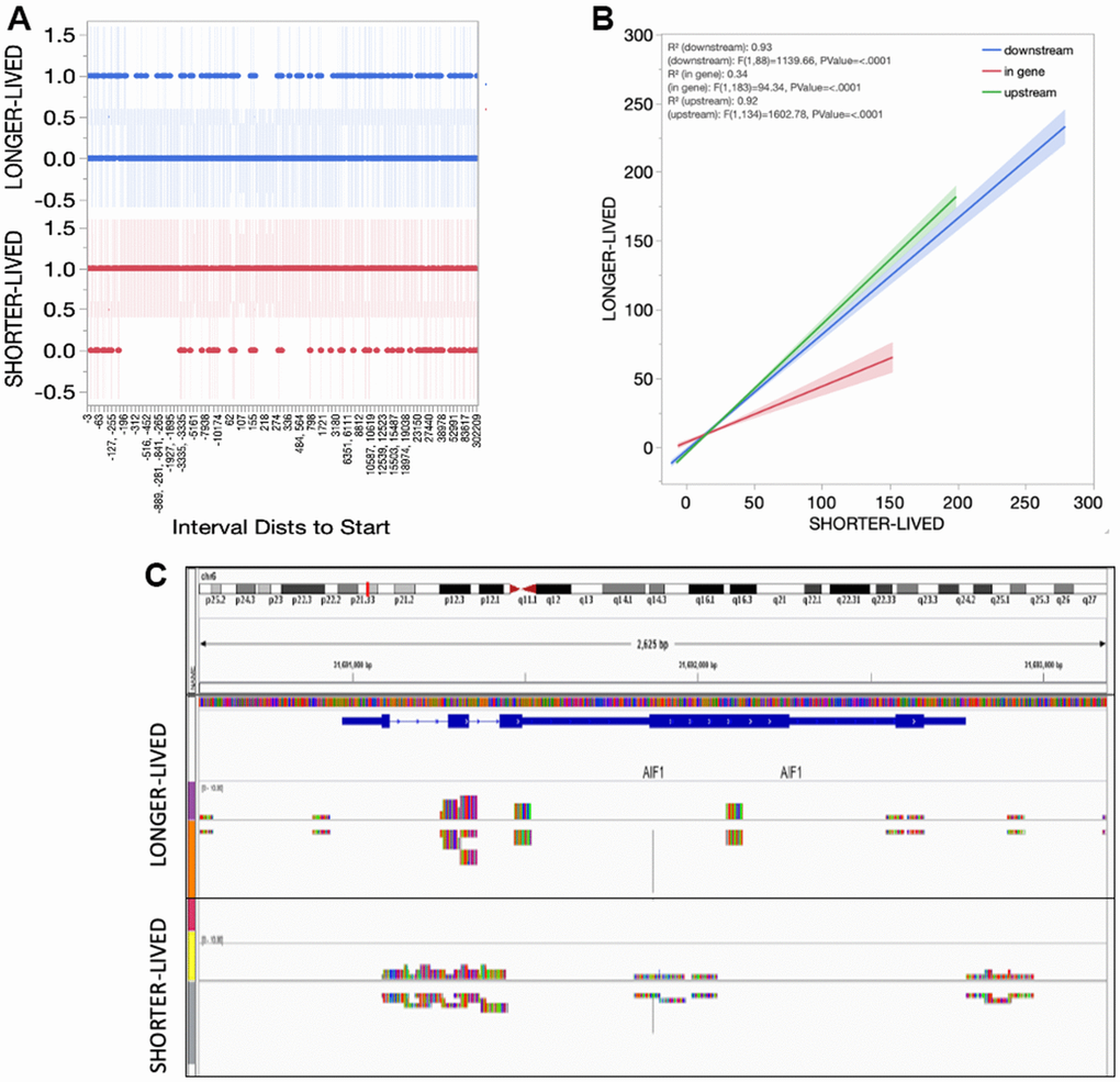 In spite of higher transcription of Sirt1, the absolute number of Sirt1 peaks was reduced in long-lived aged (>23yo) animals compared to old (18-20) (Table 2). However, the distribution of peaks indicated a smaller diversity in the genes regulated by Sirt1 in long-lived animals compared to old, characterized by gaps in the genomic intervals presenting Sirt1 peak reads in long-lived animals (Figure 5A). On the other hand, the detailed analysis of intervals also indicated and enrichment of in-gene binding sites in old animals compared to long-lived (Figure 5B). The implications of these differences are unknown but may reflect more frequent disruptions in the transcriptional process occurring in old PFC, in addition to the active silencing at regulatory regions. Figure 5C shows an example of these functional amendments in the AIF1 gene that encodes Iba1, indicating a concentration of Sirt1 peak signal on promoter and regulatory regions (resembling controls [26]) in long-lived animals, and a spread of Sirt1 signal in the same gene in old PFC.