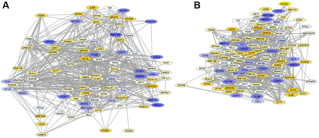 A detailed analysis of changes in Sirt1 binding between PFCs from shorter- and from longer-lived elder animals, regardless of position, indicated differences in the activity of Sirt1 on genes strongly associated by pathway (Figure 6), visualized as fold change (old/long-lived) in Genemania and analyzed using JActive Modules for the identification of active pathway connections between gene clusters with low overlapping threshold. Two main modular networks were identified (Figure 6). Module A connected 90 genes with a score 5.9 (Figure 6A). Module B connected 99 genes with a score 5.52 (Figure 6B). The enrichment in Sirt1 activity in these networks may signify processes that are actively disrupted or downregulated in shorter-lived animals compared to longed-lived elders, and vice-versa.