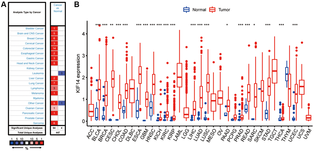 In the present study, pan-cancer analyses of KIF14 expression were performed via Oncomine and TCGA databases. Survival analyses indicated that high expression of KIF14 was correlated with worse prognosis in various cancer types, including LUAD.