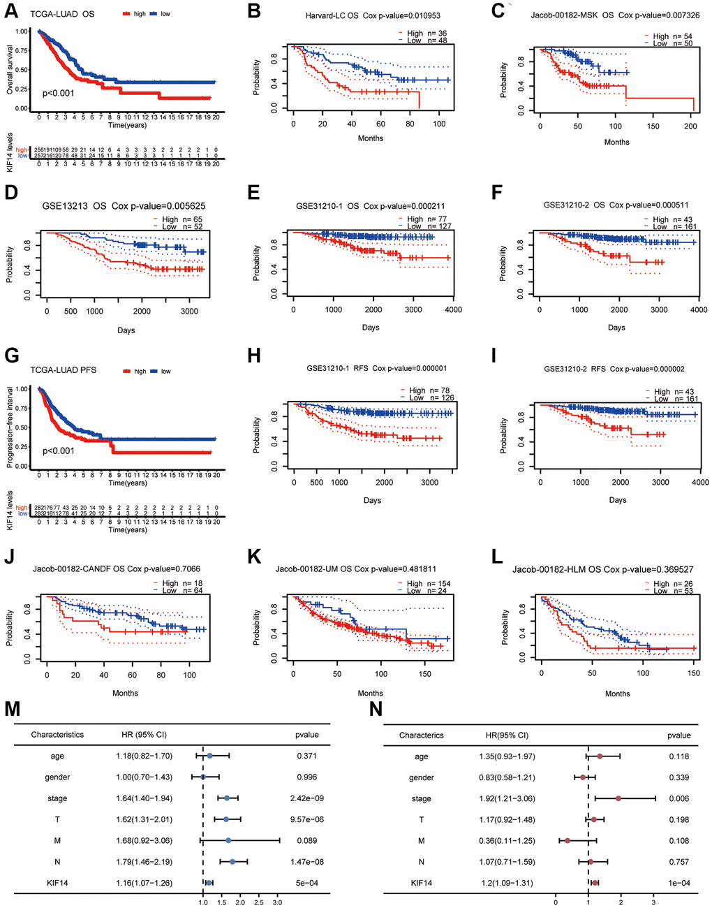 The Kaplan-Meier (K-M) survival analysis was conducted to assess the correlation between KIF14 expression and survival outcomes (PFS and OS) in pan-cancer according to the TCGA database. Both OS and PFS results demonstrated that high KIF14 expression could predict unfavorable prognosis in LUAD, PAAD, mesothelioma (MESO), LIHC, KIRP, KIRC, and adrenocortical carcinoma (ACC) (Figure 2A and 2G, Supplementary Figures 1 and 2). Next, we verified the results of LUAD via the PrognoScan database (http://dna00.bio.kyutech.ac.jp/PrognoScan/index.html) [22] (Table 1). Notably, high KIF14 expression was significantly correlated with shorter OS (Figure 2B–2F) and relapse-free survival (RFS) (Figure 2H and 2I) in seven out of ten independent cohorts. In the remaining three cohorts [23] (jacob-00182-CANDF, jacob-00182-UM, and jacob-00182-HLM cohorts, Figure 2J–2L), the OS of KIF14 upregulation group was still shorter than that of KIF14 downregulation group, but no significant difference was observed. For TCGA-LUAD cohort, both univariate and multivariate Cox regression analysis revealed that KIF14 was an independent prognostic factor for OS (Figure 2M and 2N), with Akaike information criterion (AIC) = 1094.23, p-value = 1e-04. Altogether, these results demonstrate that KIF14 can serve as a prognostic biomarker for patients with LUAD.