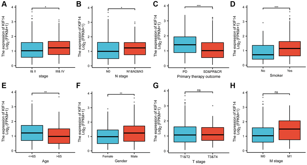 To evaluate the correlation between KIF14 expression level and clinicopathological features (e.g., TNM stage and age in diagnosis), Chi-squared tests were performed via using the “beeswarm” package in R.