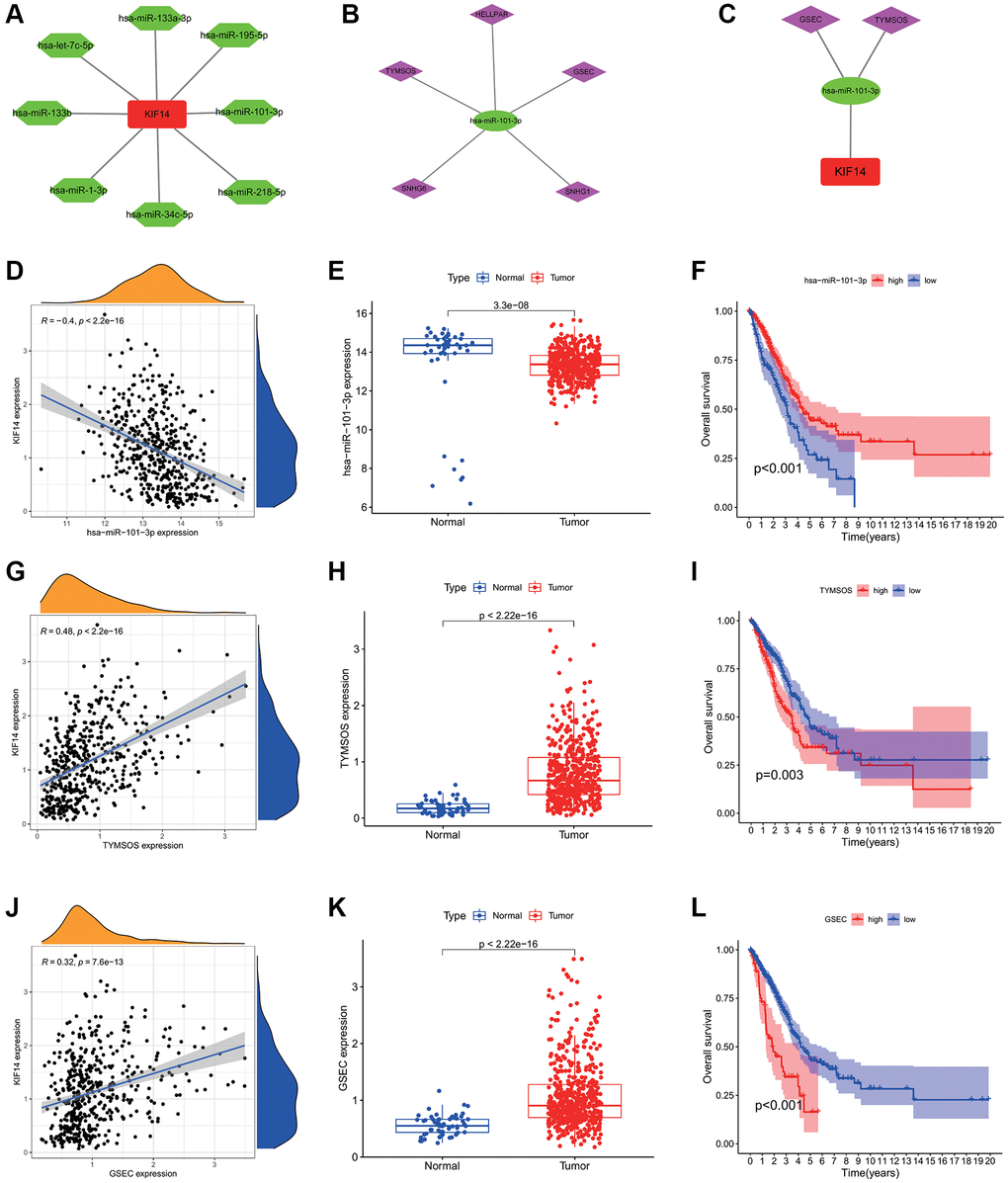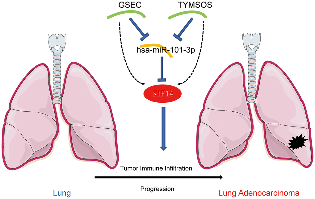 In conclusion, KIF14 was upregulated in various cancers including LUAD, and contributed to unfavorable prognosis in LUAD patients. GSEC and TYMSOS/hsa-miR-101-3p/KIF14 ceRNA network was identified as a novel upstream regulatory mechanism of KIF14 in LUAD. Moreover, KIF14 exerted an oncogenic role via influencing tumor ICI and immune checkpoint-related gene expression. Nevertheless, further experimental studies are warranted to verify our findings in the near future.