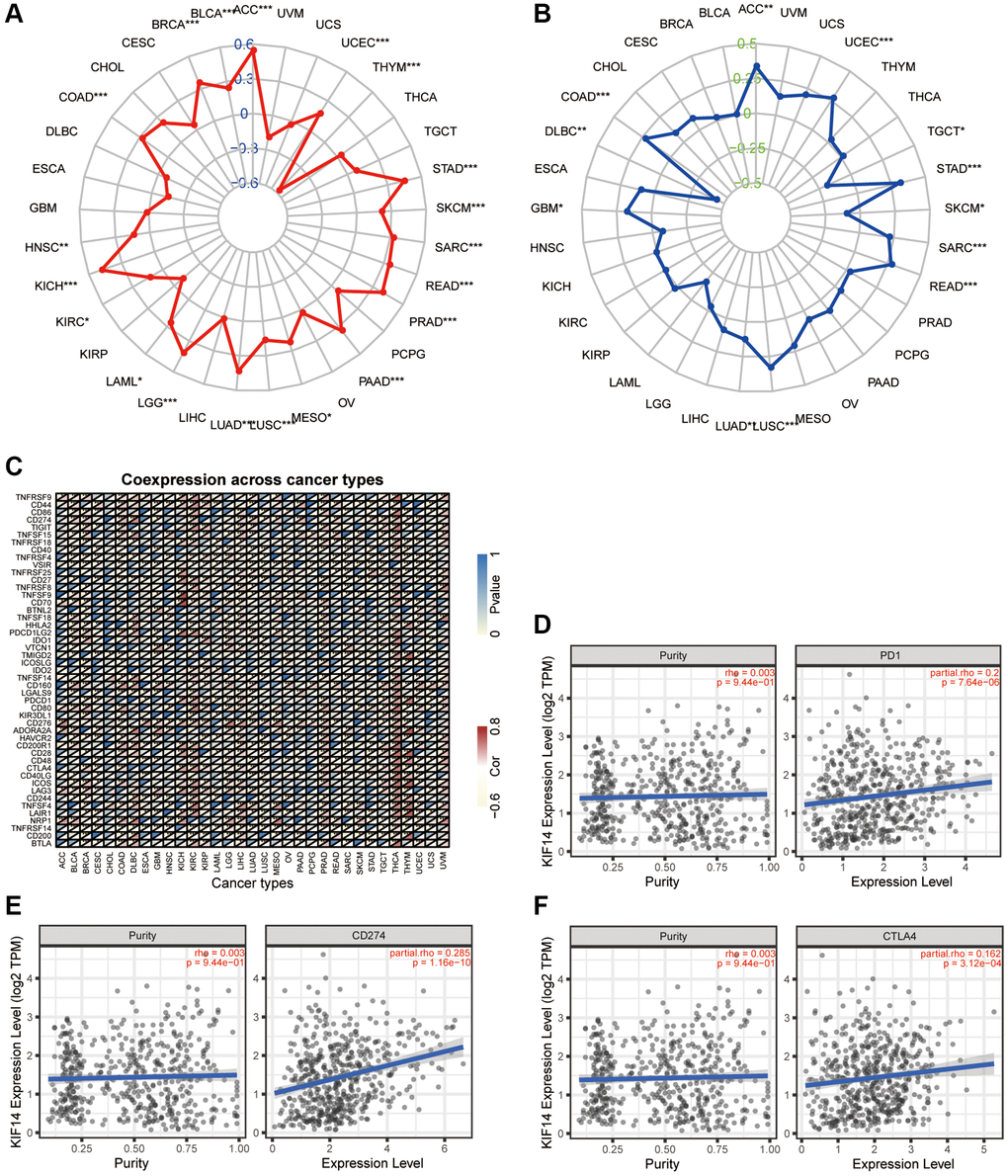 In the present study, both expression and survival analyses were conducted on KIF14 in pan-cancer with an emphasis on LUAD. Moreover, the association between KIF14 and long non-coding RNAs (lncRNA) or microRNAs (miRNAs) in LUAD were evaluated. In addition, we explored the relationships of KIF14 with immune checkpoints-related genes, immune cell biomarkers and immune cell infiltration (ICI) in LUAD. The results indicated that lncRNAs- and miRNAs-regulated overexpression of KIF14 was associated with tumor immune infiltration and unfavorable prognosis in patients with LUAD.