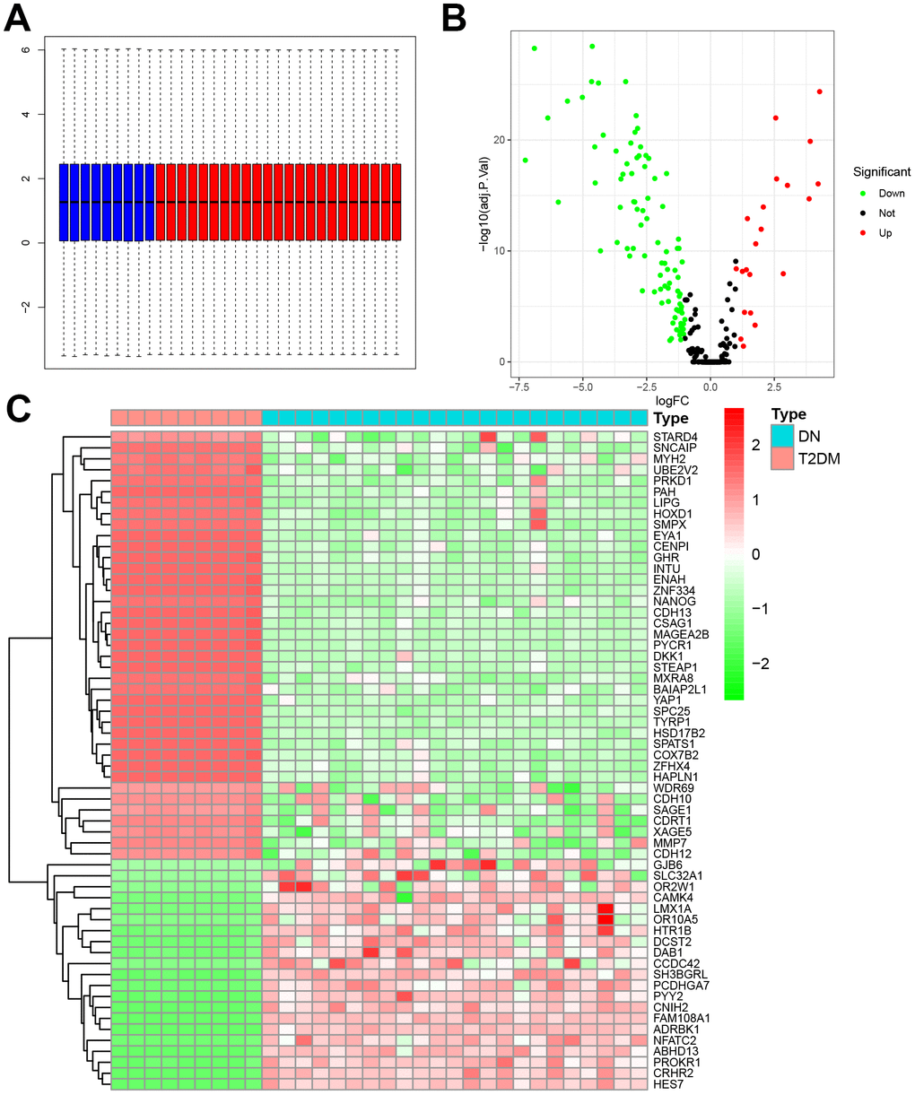 Using 23 DN samples and 9 diabetic samples, we performed differential expression analysis to obtain the DEGs that can be associated with DN. First, we merged the expression data of the DN group of GSE142153 and the T2DM group of GSE26168 to exclude the bath effects. The boxplot showed the whole gene expression levels of the merged dataset were approximately the same, which indicated no batch effect (Figure 1A). Using the criteria of |log2-fold changes (FC)|>1.0 and adjusted P <0.05, we obtained 110 DEGs, including 9 upregulated DEGs and 101 downregulated DEGs between the two groups (Figure 1B). The top 60 DEGs were presented in the hierarchical clustering heatmap (Figure 1C), including the significantly upregulated or downregulated DEGs.