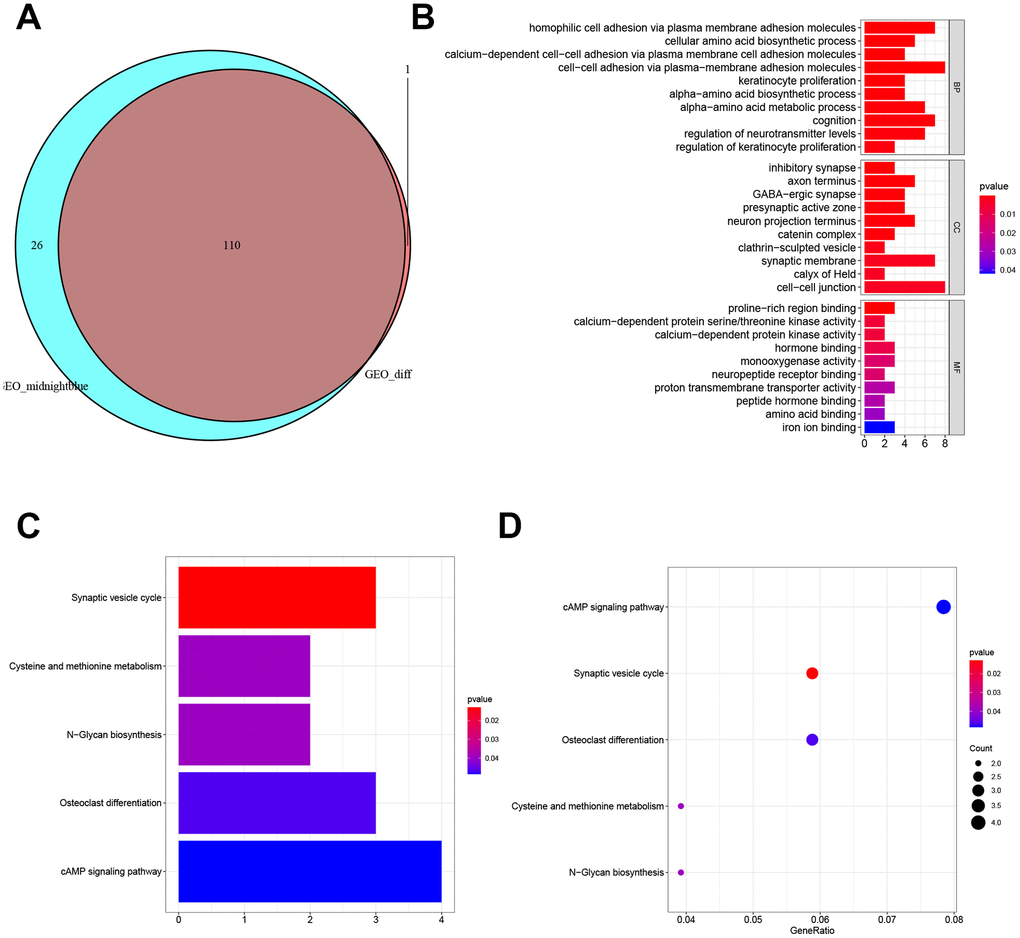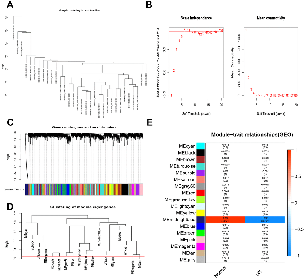 Using WGCNA that describes the expression correlation among multiple genes, we identified the genes of interest. Two analytical methods were applied to identify the target genes. First, we performed the cluster analysis to assess sample similarity. The outlier’s detection identified three samples that were removed (GSM4221586, GSM532842, GSM4221594, Figure 2A). To construct a scale-free network, we performed WGCNA, and the scale-free topological fitting index was 0.88 and the mean connectivity was 90 by setting the soft threshold power at 10 (Figure 2B). Furthermore, we carried out hierarchical clustering to identify different kinds of gene modules using weighted gene co-expression correlation, which can be found through the branches of clustering tree and different colors. We identified 18 modules in size from 20 to 10000 in the network, and merged cut highs of 0.25 (Figure 2C). The 18 modules can be separated into three clusters according to the correlations among the modules (Figure 2D). Besides, the weighted coexpression correlations of all genes were presented in a heatmap plot (Figure 2E). The module MEmidnightblue showed the highest correlations, the correlation coefficients between the control group and the DN group were 0.99. Finally, we obtained 136 highly-related genes in the TOM matrix with a threshold greater than 0.1. The results of the two analyses can be overlapped, and a list of 110 target genes were identified, which may be involved in DN (Figure 3A).