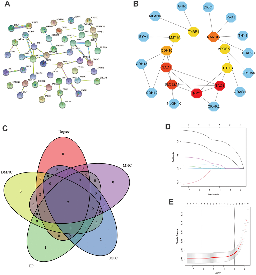The occurrence of DN may involve complex pathogenesis and biological processes, and understanding the potential function of target genes will help with DN treatment. The GO enrichment analysis indicates these target genes are mainly related to membrane adhesion, alpha-amino acid biosynthesis, metabolism, and binding, terminus, inhibitory synapse, clathrinid-sculpted vesicle, kinase activity, hormone binding, receptor activity, and transporter activity (Figure 3B). KEGG analysis indicates synaptic vesicle cycle, cysteine and methionine metabolism, N-Glycan biosynthesis, osteoclast differentiation, and cAMP signaling pathway can be involved in the process of DN in diabetic patients (Figure 3C, 3D). We also built the PPI based on these target genes (Figure 4A), and identified the top 10 hub genes: LMX1A, TYRP1, NANOG, ADRBK1, HTR1B, TAC1, NPY, SLC32A1, GAD1, and CDH10 (Figure 4B). Finally, we identified the hub genes using five algorithms (Figure 4C). We overlapped the results of the five algorithms and obtained the final hub genes that were used for model building: ADRBK1, LMX1A, HTR1B, CDH10, TAC1, NPY, and SLC32A1.