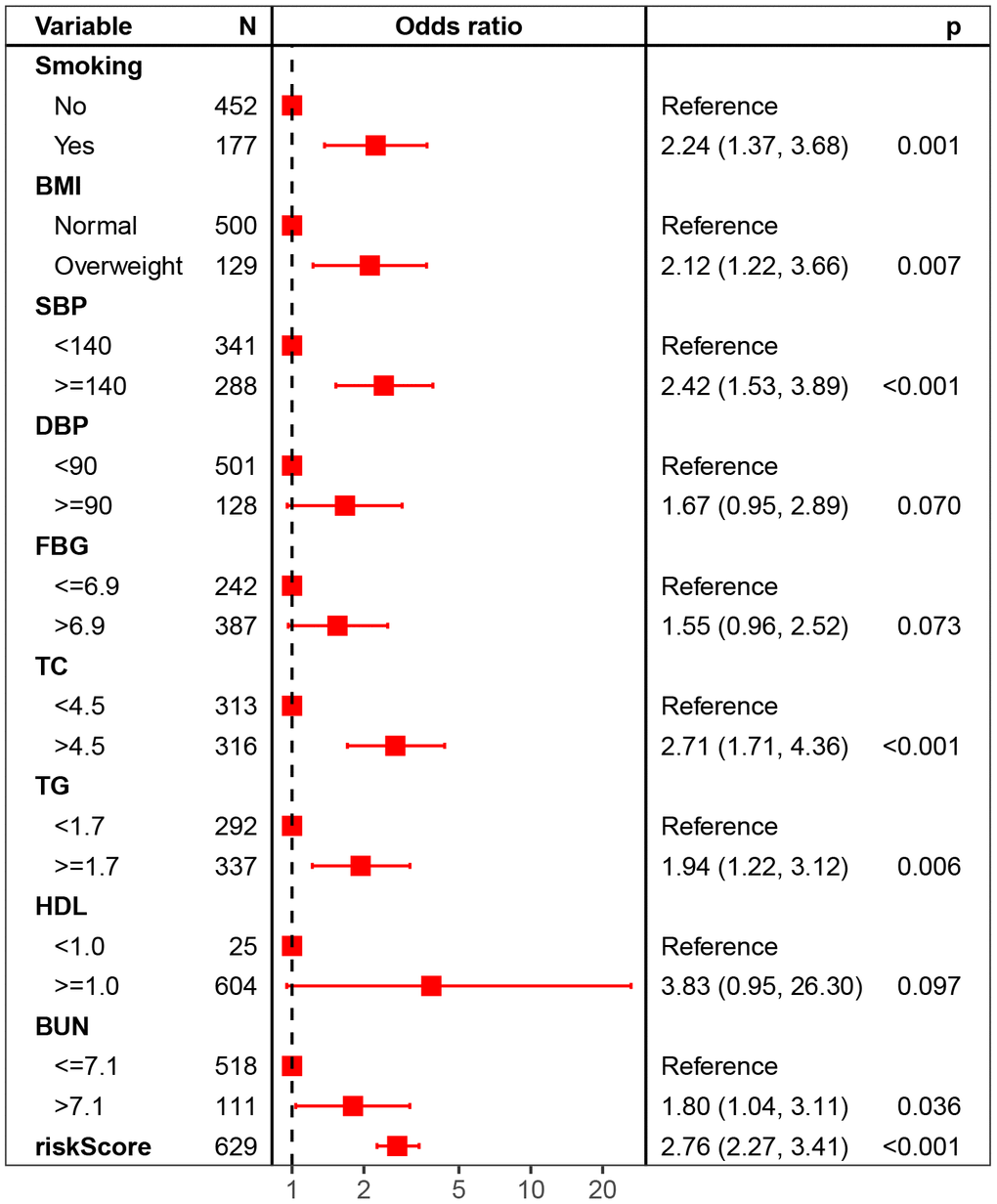 The general characteristics between the DN group and the non-DN group were compared. The risk scores were higher in the DN group than in the non-DN group (10.54 vs. 9.03, P<0.001; Table 1). The DN group had higher proportions of males (65.4% vs. 55.9%, P=0.042) and smokers (42.6% vs. 23.1%, P<0.001). The SBP (P<0.001) and FBG (P=0.016) levels were higher in the DN group than in the non-DN group. The TC, TG and BUN levels were also significantly elevated in the DN group (P<0.001). No significant differences were observed in age >60, drinking status, DBP>=90 rate, and HbA1c, HDL, LDL, SCR, or UC levels (P>0.05). The univariate logistic regression indicated the risk score was positively associated with DN (OR (95%CI): 2.72 (2.26-3.26), P<0.001). Besides, male (1.49 (1.03-2.17), P=0.034), FBG>6.9 (1.62 (1.11-2.38), P=0.013), overweight or obesity (1.84 (1.21-2.78), P=0.004), DBP>90 (1.55 (1.02-2.37), P=0.042), and smoking (2.47 (1.69-3.60)), SBP>140 (2.23 (1.55-3.22)), abnormal TC (2.68 (1.84-3.91)) and TG (2.16 (1.48-3.14)), and elevated BUN (2.45 (1.60-3.77)) (all P<0.001) were also risk factors of DN in diabetic patients (Table 2). Using these significant variables in the univariate logistic regression, we performed multiple logistic regression. Our results indicated that risk score was an independent risk factor of DN for diabetic patients (OR:2.76, 9%CI: 2.27-3.41, P<0.001). Besides, smoking, overweight, SBP>=140, abnormal TC, TG and BUN were also risk factors of DN (Figure 5).
