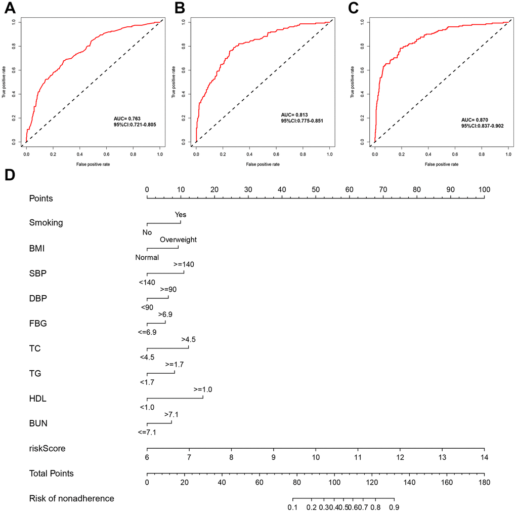 To validate the model, we built the following three models: model 1: risk score, mode 2: clinical parameters; model 3: risk score and clinical parameters. For models 1 and 2, the AUCs were 0.763 (95%CI: 0.721-0.805, Figure 6A) and 0.813 (95%CI: 0.775-0.851, Figure 6B) respectively. Model 3 showed the highest predicting ability (AUC:0.870, 9%CI: 0.837-0.902, Figure 6C). Based on model 3, we built a nomogram plot to evaluate the risk probability of DN for individuals (Figure 6D). We only included the significant variables in the univariate logistic regression into the nomogram. Specifically, we can get a point for each variable. We summarized the points of all variables in the nomogram. The summarized points can be projected onto the risk of nonadherence. Then we can know the risk probability of individuals. These descriptions were added in the manuscript.