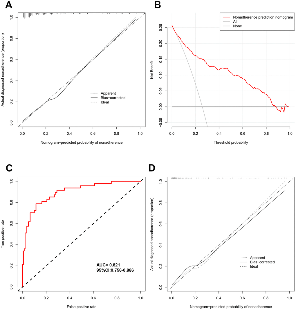 Furthermore, we evaluated the agreement between actual diagnosed probability and nomogram-predicted probability. Results showed relatively high agreement (Figure 7A). The calculated C-index was 0.870, suggesting that the model has high prediction accuracy. Moreover, decision curve analysis for DN risk indicated that T2DM patients will benefit from this DN risk prediction model when the threshold probability of a patient and clinician was 25%, meaning the net benefit is relatively high based on the DN risk nomogram (Figure 7B). To further assess the model, we randomly extracted half of the whole study sample to validate the prediction model. The internal validation showed that the AUC was 0.821 (95%CI: 0.756-0.886, Figure 7C), and the calibration curve of this sample also indicated high performance (Figure 7D). These results suggest that the DN prediction model can help clinicians make decision for T2DM patients.