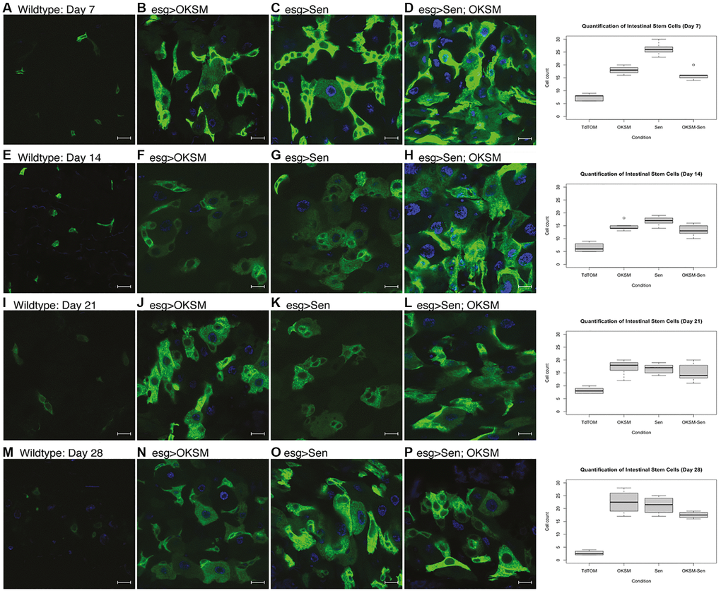 We began by looking at the effect of OKSM and Sen on stem cells in an intestinal stem cell (ISC) model [34, 35]. We chose to investigate phenotypic effects specifically in the digestive system of Drosophila (Supplementary Figure 1). As in mammals, the Drosophila gastric lining has a high turnover of cells which is enabled by stem cell pools that replenish the epithelia [34]. Age-dependent loss of stem cells and degradation of barrier function has been shown to contribute to age-dependent functional decline and mortality in Drosophila [36]. The Drosophila gut is composed of four cell types: enterocytes (ECs or absorptive cells), enteroendocrine (EEs or secretory cells), enteroblasts (EBs or transit amplifying cells) and intestinal stem cells (ISCs). ISCs rest on the external surface of the gut epithelium away from the gut lumen, and divide symmetrically to generate more ISCs, or asymmetrically to form EBs [37]. The small, bright green cells or ISCs, can be observed either by expression of the stem cell determinant escargot (esgGal4>UAS-GFP), or by using a marker of Wnt activation, β-catenin (armadillo or arm in Drosophila), observable by GFP construct inserted into the endogenous locus [38].