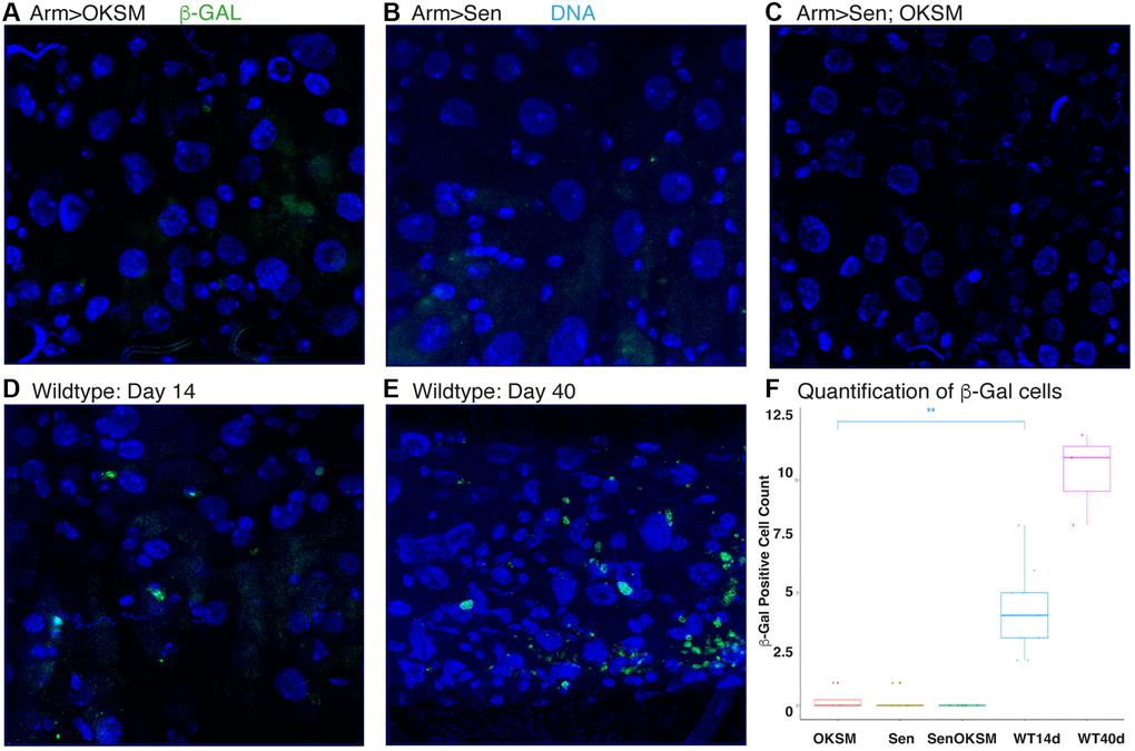 Recent studies have identified factors involved in senescence and SASP in Drosophila [41–43]. Based on these studies, we used an assay for senescence-associated β-galactosidase (SA-β-gal) to examine whether Sen expression affected the number of senescent cells. We observed a marked absence of SA-β-gal in fly midguts constantly expressing Sen, OKSM and the Sen-OKSM combination at day 40 as compared to both younger and older control flies (Figure 2A–2E and quantified in 2F). The surprising finding was that all three treatments led to the lowering of senescent cells.