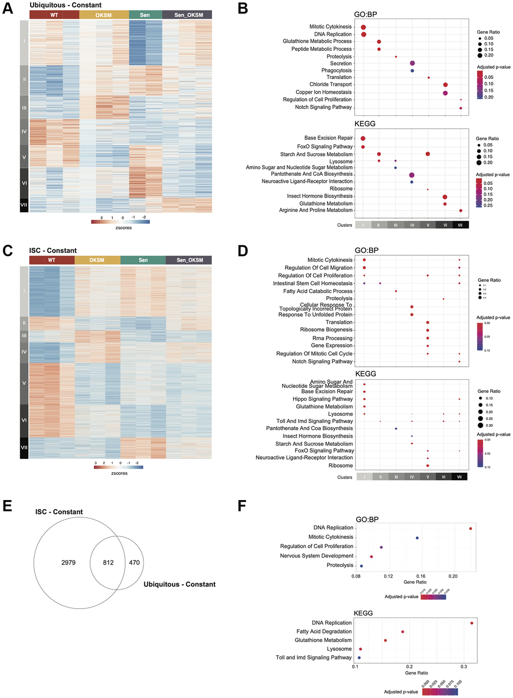 In the ISC-restricted expression model, we identified 3791 genes (FDR < 10%) as significantly differentially expressed across conditions (Supplementary Table 2), which were subsequently clustered into seven distinct groups (Figure 3C, 3D, Supplementary Figure 2). Cluster I (N = 991) contained genes that were upregulated in all three conditions relative to WT. Genes in this cluster were associated with cytokinesis, cell cycle, cell migration and DNA replication, further supporting that in ISCs expression of these factors, in any combination, results in increased proliferation and migration of ISCs. Genes in Cluster II (N = 271) were downregulated by the expression of OKSM or Sen. This cluster contained transcription regulators and genes involved in ISC homeostasis. Cluster III (N = 233) consisted of genes that were specifically upregulated by OKSM, and downregulated in the other conditions, and was enriched for fatty acid degradation and peroxisome function. Cluster IV (N = 410) consisted of genes that were upregulated in all conditions, although to a lower extent in Sen, and was enriched for genes involved in vesicle transport and Toll signaling. Cluster V (N = 825) contained genes that were downregulated in all conditions, and contained genes involved in protein translation and signaling pathways. Genes in Cluster VI (N = 642) were downregulated by all of the constructs investigated, albeit not as much by expression of OKSM, and contained genes involved in peroxisome function. Cluster VII (N = 419) contained genes that were upregulated in either Sen or Sen-OKSM and was enriched for genes involved in key signaling pathways and apoptosis. Overall, our transcriptional analysis suggested that gene expression was affected by the expression of Sen or OKSM individually, but that there was not a distinct group that was differentially expressed specifically in response to the combination (Sen-OKSM). Overall, OKSM expression upregulated misfolded protein response and Toll signaling, while downregulating Insulin secretion and protein translation, whereas Sen expression activated Wnt and Hedgehog signaling and downregulated Toll and mTOR pathways.