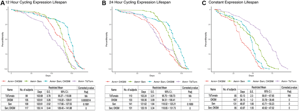 We next looked at lifespan effects. Continuous expression of OKSM is detrimental in mice while repeated short-term expression was beneficial [13]. We expressed OKSM in ISCs only (Supplementary Figure 2A) or ubiquitously (Figure 4C), both of which led to a significant detriment in lifespan.