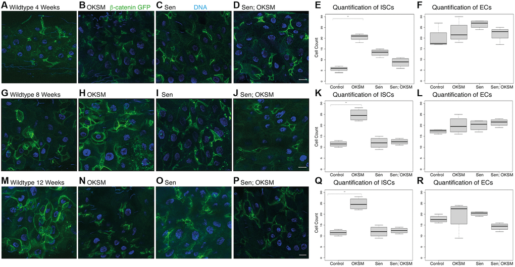 We reasoned that longer-lived flies should maintain stem cell pools for longer due to stem cell rejuvenation through OKSM expression. To test this hypothesis, we examined the midguts from flies expressing the various transgenes over a time course of 28 days using cycling expression of 12 hours twice per week. As these flies were expressing the factors ubiquitously, we could not use the esg>GFP marker for ISCs and instead used an endogenously GFP-tagged allele of the Wnt responsive β-catenin gene [38]. ISCs show higher levels of cytoplasmic β-catenin protein making them readily identifiable, but in addition other cell types in the epithelium show junctional β-catenin [45]. We visualized ISCs in gastric epithelia of flies with cycling expression of OKSM, Sen or both at four weeks (Figure 5A–5D), eight weeks (Figure 5G–5J), and twelve weeks (Figure 5M–5P). We observed and quantified a higher number of ISCs in flies when OKSM was expressed (Figure 5E, 5F, 5K, 5L, 5Q, 5R). These findings were not consistent with a loss of stem cells in aging organisms, but rather may reflect the loss of stem cell functionality that comes with accumulated damage [46].