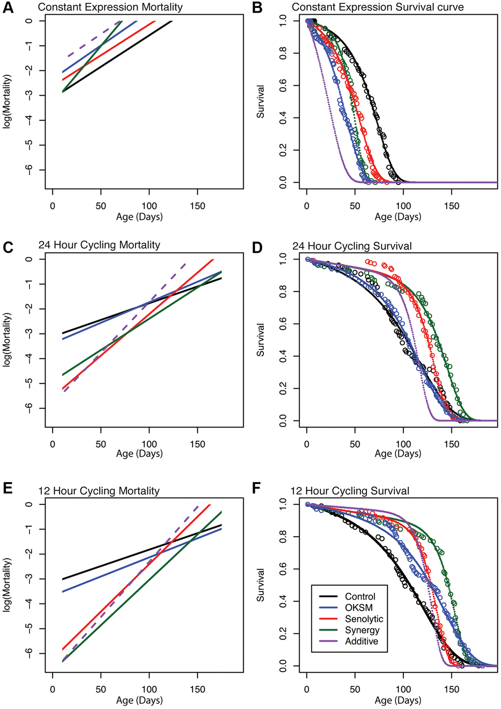 When investigating the interaction between Sen and OKSM treatments, it is useful to compare observed effects to a hypothetical survival and mortality trajectory constructed by assuming that the two interventions act independently (see materials and methods for details). Comparing the OKSM-Sen group to this hypothetical cohort (purple dashed lines in Figure 6) revealed that the actual, observed effects cannot be explained without a direct interaction between Sen and OKSM in terms of aging rate. On their own, both interventions accelerate aging rate (decrease MRDT) but lower early mortality. However, when combined, these interventions result in a reduction, rather than further increase, in the age-acceleration penalty while further augmenting early mortality benefits. This synergistic interaction between OKSM and Sen is the reason why the combined treatment improves both maximum and median lifespan more significantly than either of the two interventions alone. Mechanistically, these data imply a direct interaction between partial reprogramming via OKSM and the Sen-driven senescent cell apoptosis. Indeed, this is what we observed on the cellular level, as expression of Sen impacted the number of stem cells directly (Figure 1) even without OKSM expression.