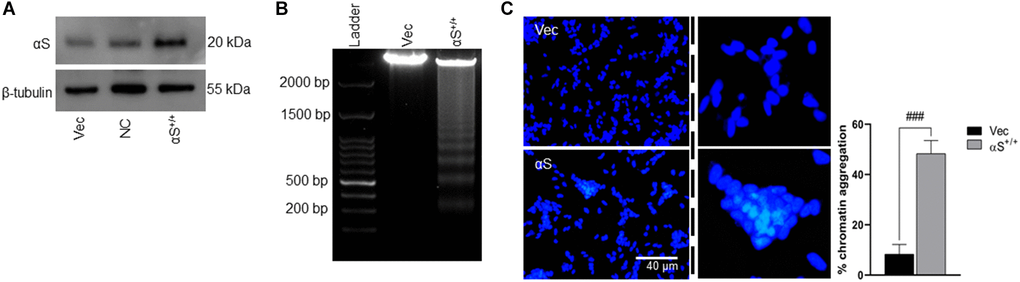 Several studies indicated that ectopic αS is a major hallmark of neuronal cell death in PD pathology [23] and that αS overexpression promotes cell death via changing sub-cellular localization [12]. Therefore, we investigated whether our αS (human) plasmid overexpression (Figure 1A) affected the viability of SH-SY5Y neuroblastoma (Figure 1B, 1C). We used DNA fragmentation (DNA ladder) and DAPI staining assay of transiently transfected vectors or αS plasmids. After 48 hours of transfection, αS showed significant chromatin aggregation and increased DNA fragmentation. αS at the nucleus masks H3 histone and inhibits H3 activities at the chromatin level [12]. Also, overexpression of sporadic or familial (A53T and A30P) αS phosphorylates at ser129 reduces cell viability via aggregation [24]. Corroborating previous findings, our data indicate that ectopic αS regulates neuronal cell fate.