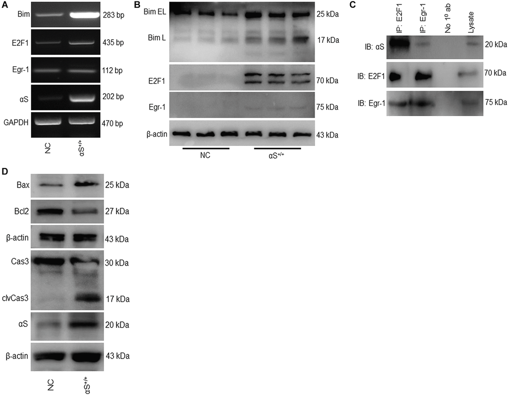 The BH3-only protein Bim is a pro-apoptotic protein that has been previously shown to upregulate during apoptosis. Bim induces apoptosis by binding to Bcl-2 or Bcl-xl and antagonizes their anti-apoptotic functions. In the αS+/+ model, both the mRNA and protein levels of Bim increased substantially (Figure 2A, 2B). A previous study demonstrated that Bim genes are transcriptionally regulated by Egr-1 and E2F1 [17, 25]. Therefore, we tested the impact of αS overexpression on Bim transcriptional factors E2F1 and Egr-1 (Figure 2A, 2B). We found that, in both mRNA and protein levels, overexpression of αS significantly upregulated E2F1 but not Egr-1. This was further corroborated by co-immunoprecipitating both transcription factors in non-transfected SH-SY5Y cells (Figure 2C). Immunoprecipitation showed that anti-E2F1 endogenously precipitated anti-αS more intensely than anti-Egr-1. Moreover, Bim is an upstream regulator of the caspase-3-mediated apoptotic signaling pathway. αS overexpression increases the Bim level that inhibits Bcl-2, frees Bax, and activates caspase-3 (Figure 2D).