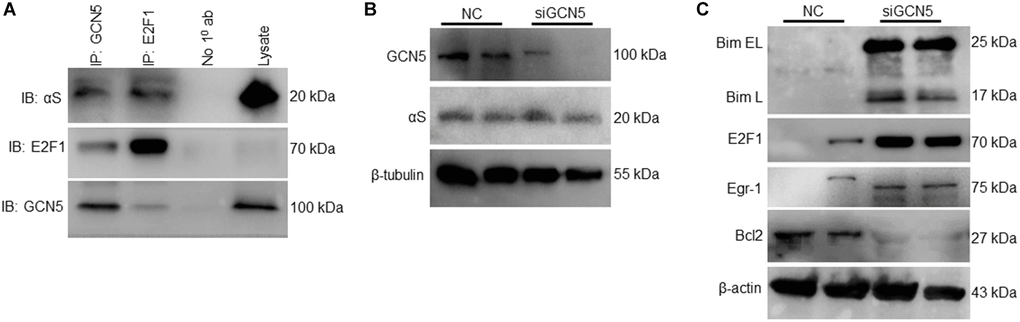 As we found αS+/+ inhibits GCN5 and regulates pro-apoptotic Bim, we tested the hypothesis that GCN5 is involved in Bim’s transcriptional regulation. To test this hypothesis, we co-immunoprecipitated GCN5 and E2F1 and probed anti-αS (Figure 4A). Since the loss of GCN5 upregulates both transcription factors of Bim [17], our results indicate that ectopic αS interacts and inhibits GCN5 and that this upregulates the E2F1 level. Next, we checked whether the knockdown of GCN5 by siRNA affects endogenous αS expression (Figure 4B); however, no significant changes were observed. siGCN5 substantially upregulates Bim, Egr-1, and E2F1 levels but decreases Bcl2 expression in neuronal cells (Figure 4C). These data suggest that GCN5 could be a potential target to reduce neuronal apoptosis in PD and other synucleinopathy.