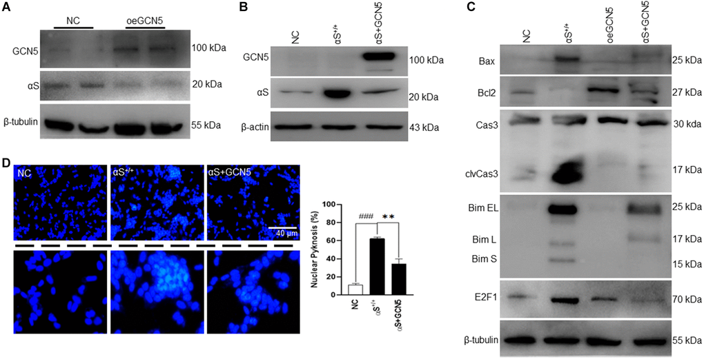 Until now, this study has indicated that αS overexpression dismantles GCN5 homeostasis, which triggers apoptosis in neuronal cells. Therefore, we hypothesized that GCN5 homeostasis by co-activation could benefit PD patients by ameliorating apoptosis. First, we tested whether GCN5 overexpression (oeGCN5) modulates αS endogenous levels (Figure 5A) and found that oeGCN5 downregulated endogenous αS expression. Later, we co-overexpressed αS and GCN5 (αS+GCN5) in SH-SY5Y cells (Figure 5B) and tested for an apoptotic marker expression (Figure 5C). The co-overexpression of αS and GCN5 were found to substantially reduce transcriptional upregulation of Bim and improve Bcl2 levels, which reduced caspase-3 activation. Subsequently, co-overexpression downregulated neuronal cell death (Figure 5D).