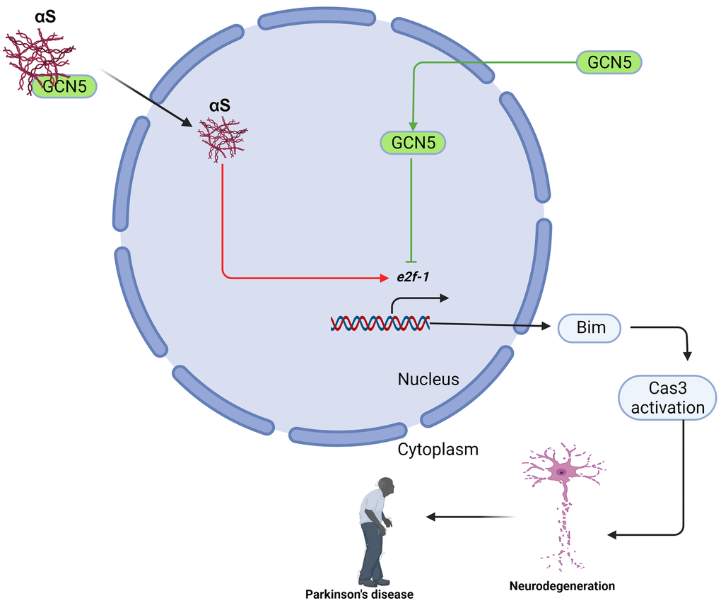 In conclusion, we showed a new role of αS overexpression in apoptosis. We also found that αS interacts with and inhibits GCN5 and loss of GCN5 promotes Bim-mediated apoptosis in neuronal cells (Figure 6). Promisingly, HDAC inhibitors have shown anti-apoptotic activities in many neurodegenerative diseases by preventing histone deacetylation. Yet, we found a new pathway in which the development of the GCN5 activator would build HAT: HDAC homeostasis and could reverse neuronal apoptosis in Parkinson’s disease pathogenesis. Since αS acts in the nucleus to promote neurotoxicity, mostly by interfering with histone acetylation and HAT member activities, our findings suggest that the development of GCN5-dependent therapeutics might benefit PD and other synucleinopathy.