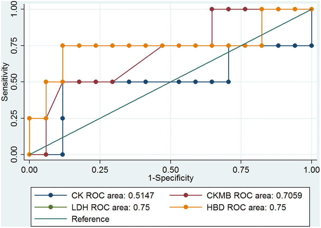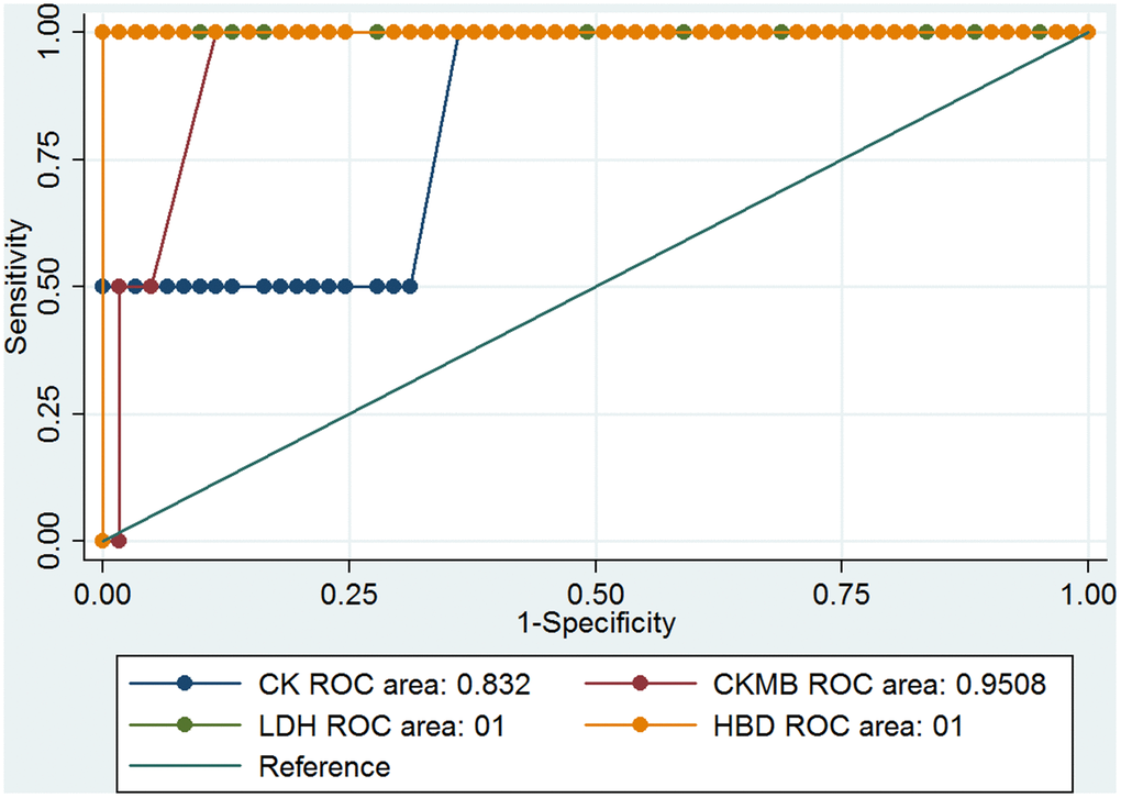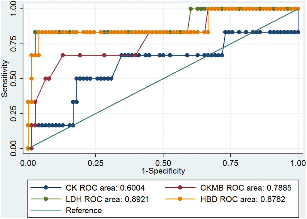 | AUC, area under the ROC curve; CK, creatine kinase; CK-MB, creatine kinase isoenzyme; LDH-L, lactate dehydrogenase-L; α-HBD, α-hydroxybutyrate dehydrogenase. | |||||||||||||||||||||||||||||||||||||||||||||||||||||||||||||||||||||||||||||||||||||||||||||||||||