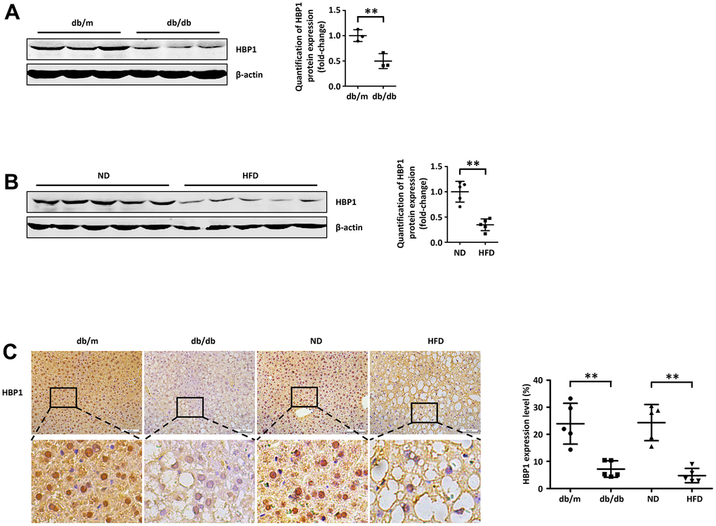 Figure 1. Hepatic HBP1 expression is low in mouse models of T2DM. (A) HBP1 protein level reduces in adult db/db mice. The protein of endogenous HBP1 was extracted from db/m and db/db mice (n=3) livers and was measured by western blotting. β-actin was detected as a loading control. Quantification was normalized to β-actin. (B) HBP1 protein level reduces in C57BL/6J mice fed by high fat diet. The protein of endogenous HBP1 was extracted from livers (n=5) of wild type (WT) C57BL/6J mice fed by normal diet (ND) and high fat diet (HFD), and was measured by western blotting. β-actin was detected as a loading control. Quantification was normalized to β-actin. (C) The HBP1 content in livers of type 2 diabetic model mice is low. Liver sections collected from db/m, db/db, ND and HFD mice (n=5) were immunohistochemically stained with anti-HBP1. Scale bar, 100 μm. Stained areas were quantitated by Image J software. Error bars represent S.D. **, p<0.01.