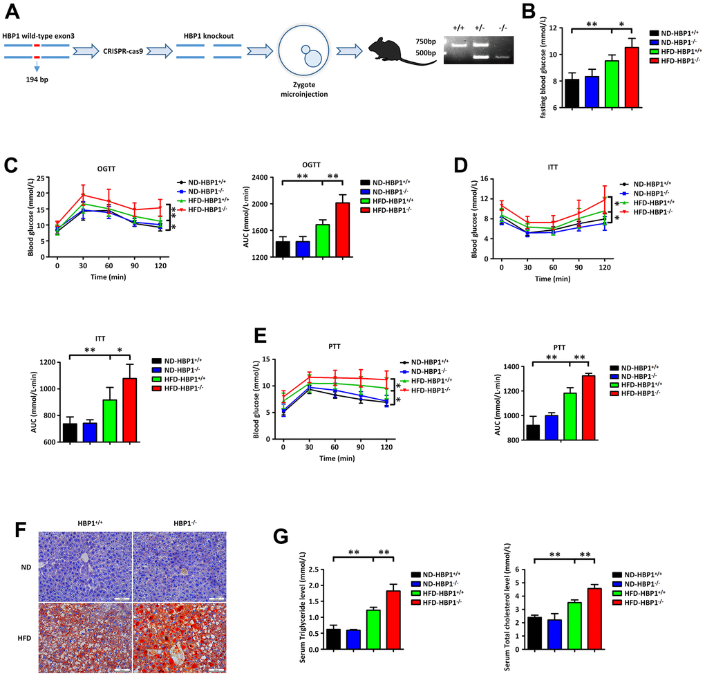 Figure 2. HBP1 knockout mice show a significant worsening of diabetes. (A) Schematic of the HBP1 knockout (HBP1−/−) mice and identification of genotypes. The genotypes were identified by PCR. The PCR product of wild type mice has only one band at the position of 611bp. The PCR product of heterozygous mice has one band at the position of 611bp and another one at the position of 417bp. The PCR product of HBP1−/− mice has only one band at the position of 417bp. (B) HBP1−/− mice fed by HFD has higher fasting blood glucose. Wild type C57BL/6J (HBP1+/+) mice and HBP1−/− mice of the same age were both divided into two groups randomly. One group was fed by ND as a control and the other was fed by HFD for 3 months to induce to diabetic mice. These four groups were fasted for 6 hours and drank water freely. After that, blood was collected from the tail vein of mice and its glucose content was measured by Roche glucometer. (C) HFD-HBP1−/− mice have more severe impaired glucose tolerance. All the four groups were fasted for 6 hours and drank water freely. After 6 hours, fasting blood glucose was recorded as 0 min point. Each mouse was given 5 mg/kg glucose by gavage and its glucose content in tail vein blood was measured by Roche glucometer every 30 minutes, up to 2 hours. (D) HFD-HBP1−/− mice are less sensitive to insulin. All the four groups were fasted for 4 hours and drank water freely. After 4 hours, fasting blood glucose was recorded as 0 min point. Each mouse was given 1 U/kg insulin by intraperitoneal injection and its glucose content in tail vein blood was measured by Roche glucometer every 30 minutes, up to 2 hours. (E) HFD-HBP1−/− mice have higher glucose excursion during pyruvate tolerance test. All the four groups were fasted for 16 hours and drank water freely. After 16 hours, fasting blood glucose was recorded as 0 min point. Each mouse was given 1 g/kg pyruvate by intraperitoneal injection and its glucose content in tail vein blood was measured by Roche glucometer every 30 minutes, up to 2 hours. (F) The livers of HFD-HBP1−/− mice have more severe steatosis. Representative photographs of liver samples were selected and analyzed by oil red O staining. Scale bar, 100 μm. (G) Serum triglyceride and total cholesterol contents in HFD-HBP1−/− mice are significantly increased. Serums were isolated from the inferior vena cava. AUC, Area Under Curve. Data were the mean ± SD by a one-way ANOVA. *, p<0.05. **, p<0.01.