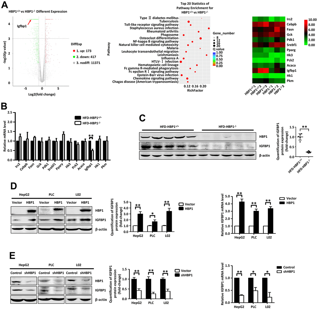 Figure 3. HBP1 increases the expression of IGFBP1 by binding to the IGFBP1 promoter. (A) RNA sequencing analysis of liver tissues from HBP1+/+ and HBP1−/− mice. (B) HBP1 affects the mRNA level of IGFBP1 in mouse liver tissues. The mRNA levels of Irs2, Cebpb, Fasn, Gck, Pdk1, Srebf1, Pparγ, Hk3, Pck2, Acaca, Igfbp1, Hk1 and Pkm2 were measured by real-time PCR in liver tissues from HBP1+/+ and HBP1−/− mice. (C) HBP1 affects the protein level of IGFBP1 in mouse liver tissues. The protein levels of HBP1 and IGFBP1 were measured by western blotting in liver tissues from HBP1+/+ and HBP1−/− mice. β-actin was used as a loading control. Quantification was normalized to β-actin, n = 5 mice per group. (D) HBP1 overexpression promotes both protein and mRNA expression of IGFBP1 in HepG2, PLC/PRF/5 and L02 cells. The cells were transfected with HA-HBP1 or pcDNA3 (as a control). The protein levels of HBP1 and IGFBP1 were measured by western blotting (left panel). β-actin was used as a loading control. Quantification was normalized to β-actin. The mRNA level of IGFBP1 was measured by real-time PCR (right panel). (E) HBP1 knockdown inhibits both protein and mRNA expression of IGFBP1 in HepG2, PLC/PRF/5 and L02 cells. The cells were stably transfected with pLL3.7-shHBP1 or pLL3.7 (as a control) through lentiviral infection. The protein levels of HBP1 and IGFBP1 were measured by western blotting (left panel). β-actin was used as a loading control. Quantification was normalized to β-actin. The mRNA level of IGFBP1 was measured by real-time PCR (right panel). Data were the mean ± SD by a two-tail, unpaired Student’s t-test. *, p<0.05. **, p<0.01.