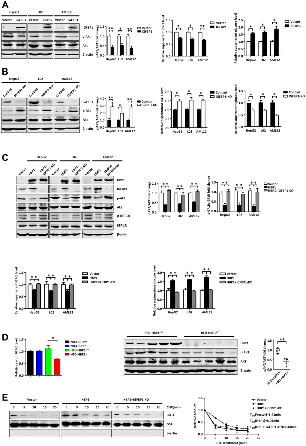 Figure 6. The HBP1-IGFBP1 axis increases extracellular glucose concentration by reducing activation of the PI3K-AKT signaling pathway. (A) IGFBP1 inhibits p-AKT signaling pathway, inhibits supernatant IGF-1 levels and elevates supernatant glucose level. The protein levels of IGFBP1, p-AKT and AKT were measured by western blotting in HepG2, L02 and AML12 cells. β-actin was used as a loading control. The content of IGF-1 in supernatant was measured by ELISA kit. The supernatant was changed from DMEM to EBSS and was collected after 24 hours. Then the supernatant glucose level was measured by glucose testing kit. (B) IGFBP1 knockout activates p-AKT signaling pathway, increases supernatant IGF-1 levels and suppresses supernatant glucose level. The protein levels of IGFBP1, p-AKT and AKT were measured by western blotting in IGFBP1-knockout HepG2, L02 and AML12 cells constructed by CRISPR/Cas 9 system. β-actin was used as a loading control. The content of IGF-1 in supernatant was measured by ELISA kit. The supernatant was changed from DMEM to EBSS and was collected after 24 hours. Then the supernatant glucose level was measured by glucose testing kit. (C) HBP1 can inhibit p-AKT signaling pathway, decreases supernatant IGF-1 levels and elevates supernatant glucose level by IGFBP1. The protein levels of HBP1, IGFBP1, p-AKT, AKT, p- IGF-1R and IGF-1R were measured by western blotting in HepG2, L02 and AML12 cells. β-actin was used as a loading control. The content of IGF-1 in supernatant was measured by ELISA kit. Then the supernatant was changed from DMEM to EBSS and was collected after 24 hours. The supernatant glucose level was measured by glucose testing kit. (D) The level of serum free IGF-1 in HFD-HBP1−/− mice is lower than that of HFD-HBP1+/+ mice (n=5), so that the PI3K-AKT signaling pathway is inhibits. The content of mice serum IGF-1 was measured by ELISA kit. The protein levels of HBP1, p-AKT and AKT were measured by western blotting. β-actin was used as a loading control. (E) HBP1 affects the stability of IGF-1 through IGFBP1. The protein levels of IGF-1, GST and β-actin were measured by western blotting. GST was used as a loading control. Data were the mean ± SD by a two-tail, unpaired Student’s t-test. *, p<0.05. **, p<0.01.