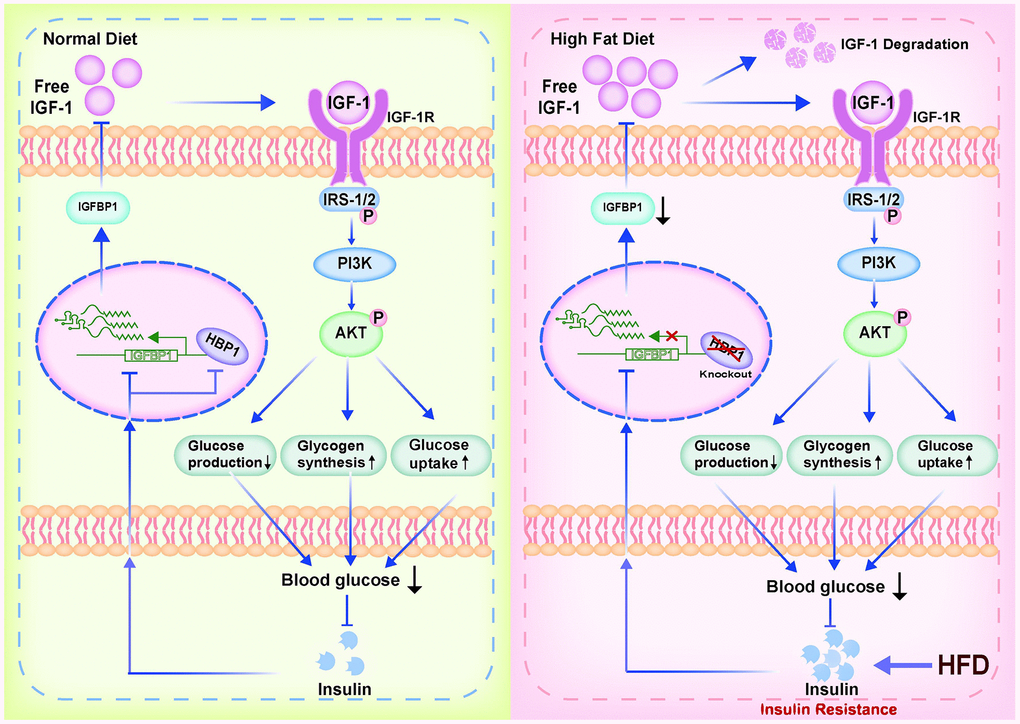 During the induction of T2DM by HFD-feeding, HBP1 knockout mice were unable to fully activate transcription from the IGFBP1 gene, resulting in significantly lower synthesis of IGFBP1 than in wild-type mice. This would make the negative feedback regulatory loop collapse early in HBP1 knockout mice when challenged by an HFD. This would explain the earlier loss of the hypoglycemic effect of IGF-1, earlier disruption of glucose homeostasis, and earlier development of T2DM identified in the HBP1 knockout mice.