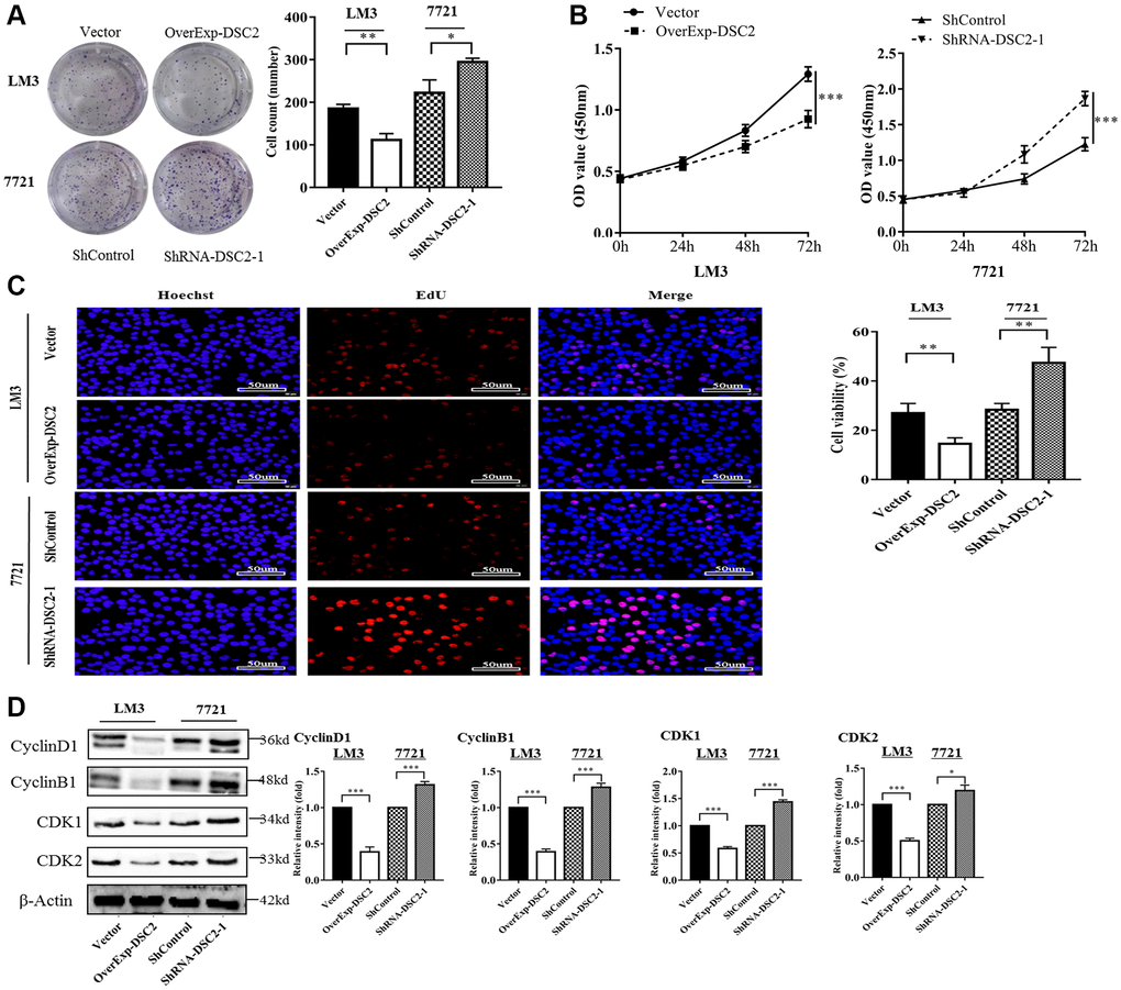 To explore the effect of DSC2 on cell proliferation, we detected the proliferation ability of transfected cells by using colony formation, CCK-8, and EdU assays. Results indicated that the formation of tumor cell colonies was significantly inhibited in overExp-DSC2-transfected LM3 cells (P < 0.01), while promoted in shRNA-DSC2-transfected 7721 cells (P < 0.05) (Figure 2A). Similarly, CCK8 assay showed that there were significantly lower rates of cell proliferation in LM3 cells with overExp-DSC2, but higher proliferation rates in 7721 cells with shRNA-DSC2 (Figure 2B, P < 0.001). We further verified the effect of DSC2 on proliferation by using the EdU experiment. It was also found that the proliferation capacity of the overExp-DSC2-transfected LM3 cells was noticeably decreased, whereas it was increased for 7721 cells transfected with shRNA-DSC2 (Figure 2C, P < 0.01).