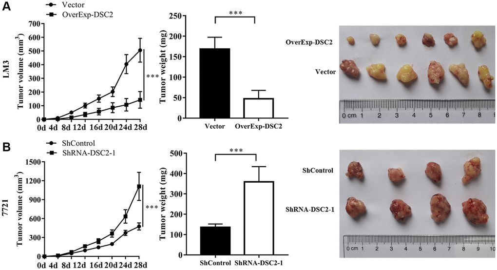 To identify in-depth the effect of DSC2 on tumor growth in vivo, the transfected cells (vector, overExp-DSC2, shControl, and shRNA-DSC2 respectively) were subcutaneously injected into the right back of 5-week-old nude mice. Tumor volume was measured and recorded every 4 days. Mice were sacrificed 28 days later for sampling. Subsequently, tumor volume and weight were determined. As shown in Figure 4A, the volume and weight of the tumors from the mice injected with DSC2-overexpressing LM3 cells were significantly lower than those from the mice injected with the vector-transfected cells (P < 0.001 for both), indicating that DSC2 overexpression inhibited the tumor growth dramatically. Additionally, as shown in Figure 4B, we found that the volume and weight of tumors in mice injected with the DSC2-knockdown cells were markedly higher than those in the mice injected with shControl-transfected cells (P < 0.001 for both), indicating the down-regulation of DSC2 promoted the tumor growth.