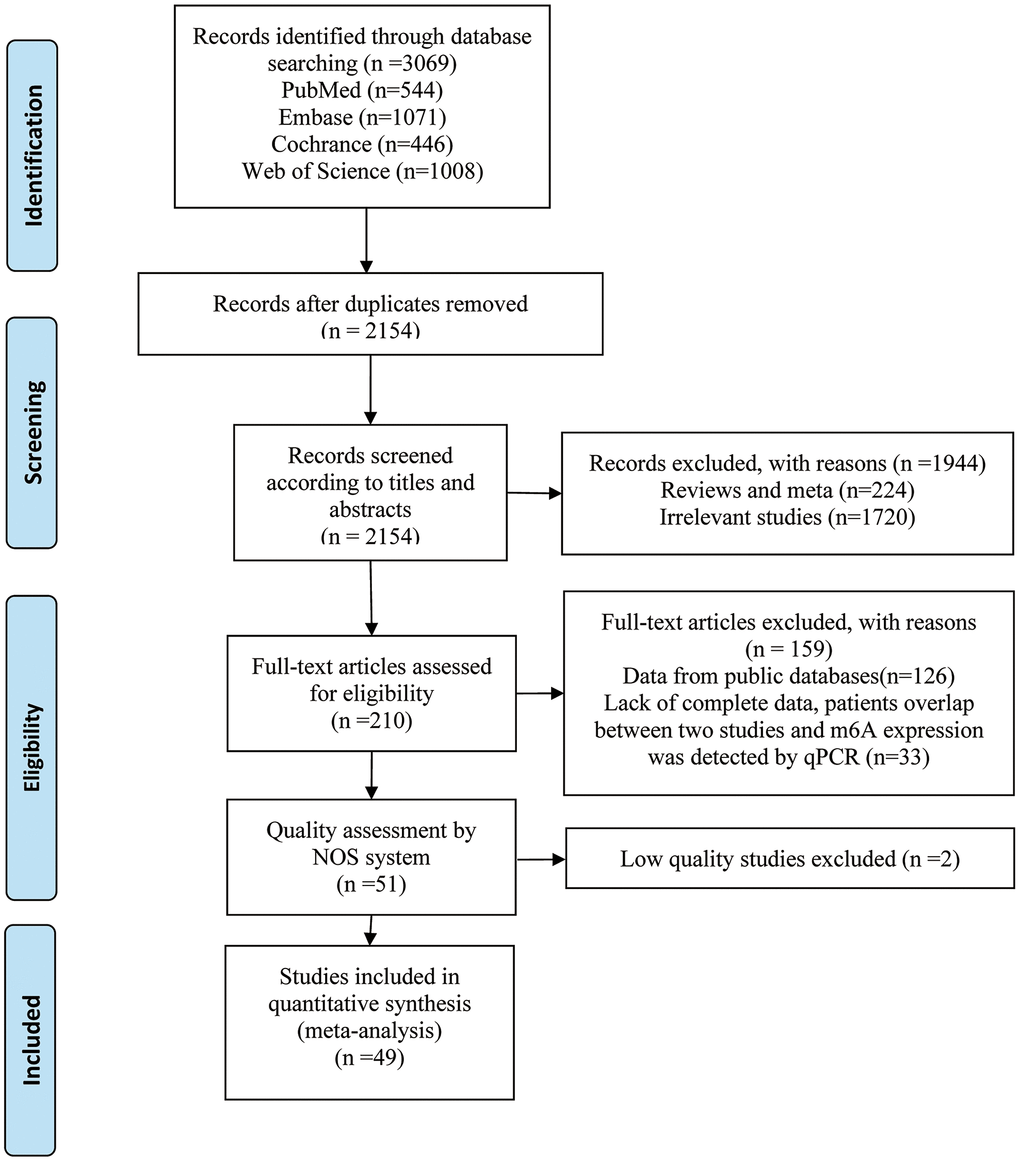 The literature selection is presented in Figure 1, and the characteristics of eligible studies are shown in Table 1. A total of 3069 relevant studies were retrieved through an initial search. Among them, 915 duplicated records and 1944 unrelated records were excluded based on title or abstract. We subjected 210 studies to full-text screening, of which 159 studies were excluded because they did not meet the inclusion criteria. The remaining 51 articles were further assessed for quality by the Newcastle-Ottawa Scale (NOS) system, and only high-quality studies (NOS ≥ 6) were included in the meta-analysis. Finally, we included 49 cohort studies [6, 15, 24–70] comprising 7006 patients. All studies were published between 2017 and 2022. Forty-eight studies were conducted in Asia and one was conducted in Europe. Sample size ranged from 31 to 603 patients per study. In 49 included studies, 27 studies involved m6A writers, 15 studies referred to erasers and 9 studies were related to readers. The included studies totally reported 20 types of cancers, including digestive system cancer (n = 33), respiratory system cancer (n = 6), urinary system cancer (n = 4), female reproductive system cancer (n = 2) and others (n = 4). With respect to survival data, 48 studies reported overall survival (OS), 9 studies presented disease-free survival (DFS), and 4 studies showed relapse-free survival (RFS).