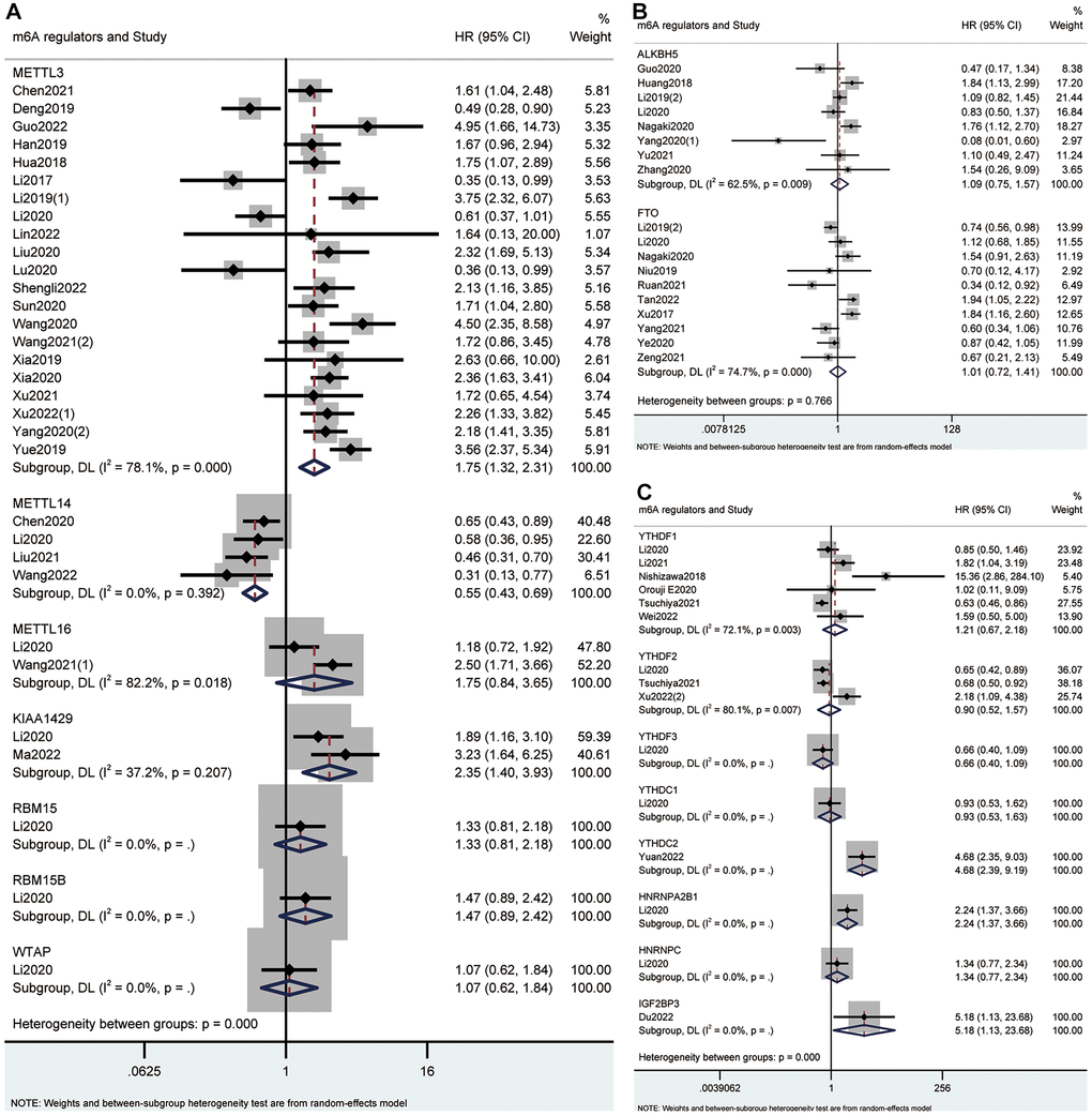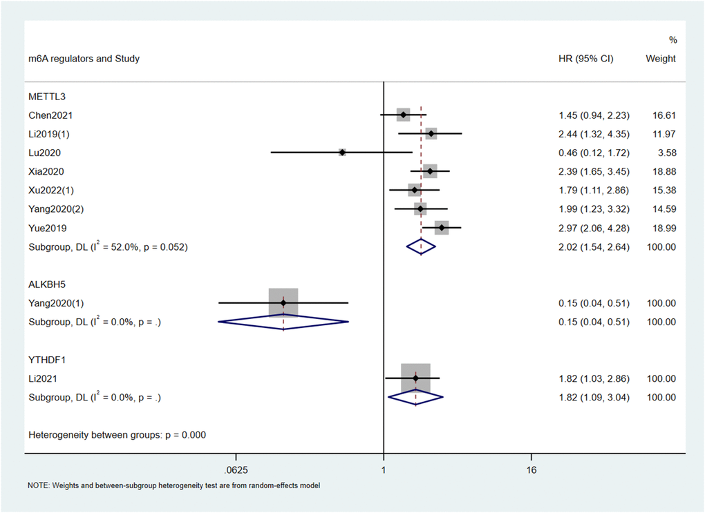 Table 2. Summary of the meta-analysis of m6A regulators and prognosis in cancer patients.