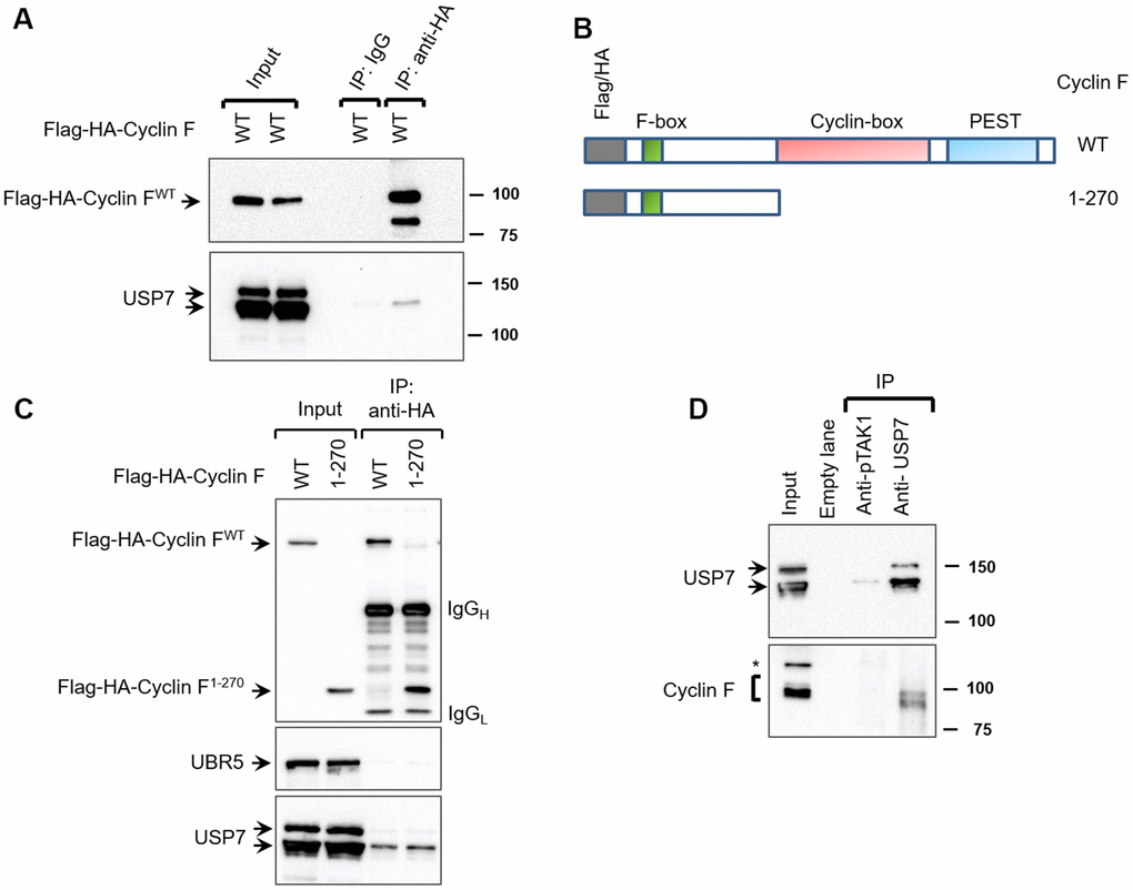 We next assessed whether endogenous cyclin F interacts with endogenous USP7. Since the commercially available antibodies against cyclin F were unsuitable for immunoprecipitation, we chose to instead immunoprecipitate endogenous USP7 and check for coprecipitation of cyclin F. In HEK-293T cells, cyclin F was detected in USP7 immunoprecipitates, suggesting that endogenous cyclin F interacts with endogenous USP7 (Figure 1D). Importantly, mock immunoprecipitation with an unrelated antibody (anti-p-TAK1) did not appreciably detect USP7 or cyclin F (Figure 1D).