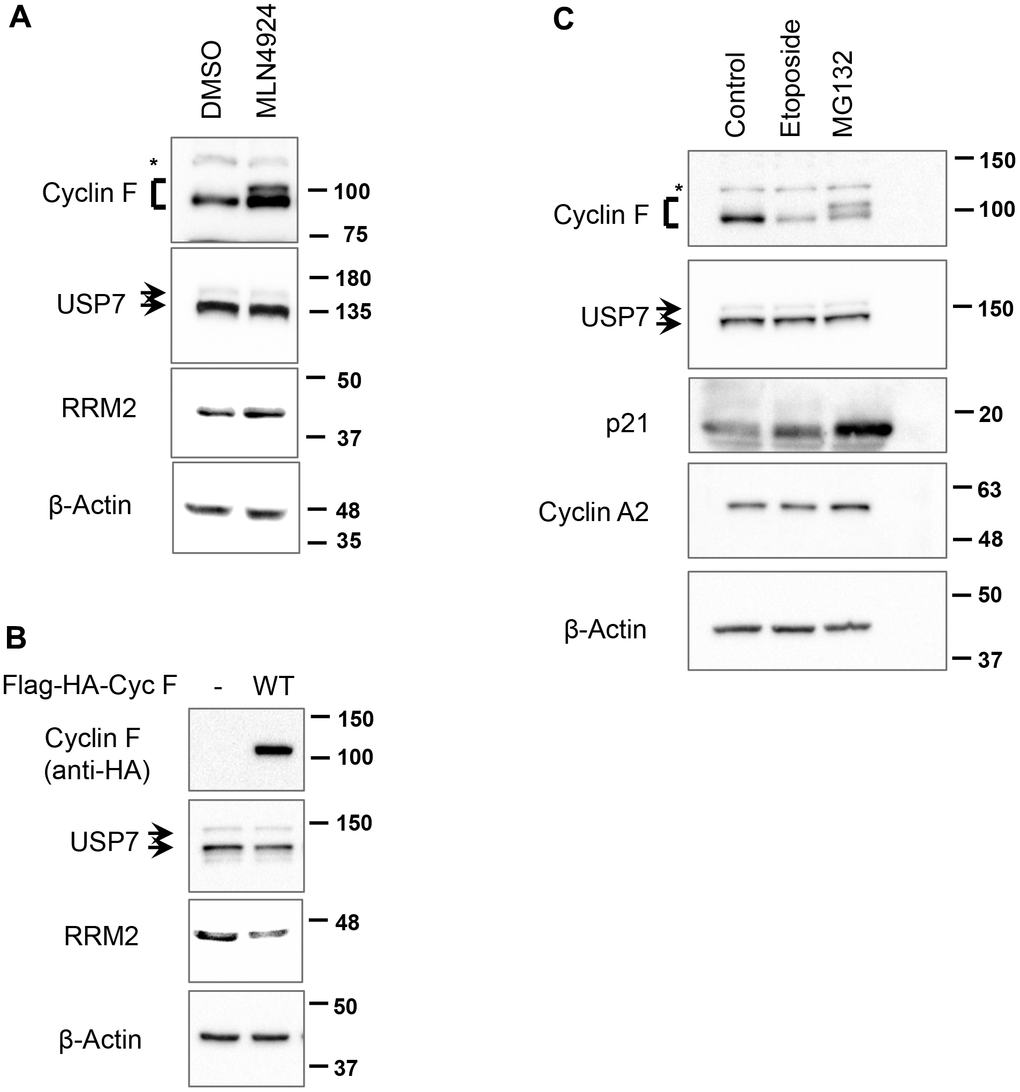Additionally, we asked whether other treatments known to decrease or increase cyclin F levels would perturb USP7 protein levels. In agreement with previous reports, we found that cyclin F is downregulated in response to treatment with DNA-damaging agent, etoposide (Figure 2C). This effect was specific to cyclin F, since cyclin A2, with which cyclin F shares the highest amino acid sequence similarity, remained unperturbed (Figure 2C). In contrast, treatment of cells with a proteasomal inhibitor, MG132, resulted in buildup of a slower-migrating cyclin F band (Figure 2C). This slower-migrating species could be interpreted as ubiquitylated cyclin F; alternatively, it might represent phosphorylated form of cyclin F. Of note, SCFβ-TrCP has been shown to target cyclin F for ubiquitin-mediated degradation following its phosphorylation by casein kinase II [18]. Thus, the slower-migrating cyclin F band might be phosphorylated form of cyclin F, accumulating due to inhibition of its degradation post MG132 treatment. p21, a short-lived protein whose stability is also regulated by the ubiquitylation pathway, is also upregulated in response to MG132 treatment, indicating that an effective concentration of MG132 was used in our experiment (Figure 2C). Importantly, treatment with either etoposide or MG132 did not affect USP7 levels (Figure 2C). Collectively, these data suggest that SCFCyclin F does not regulate USP7 protein levels.