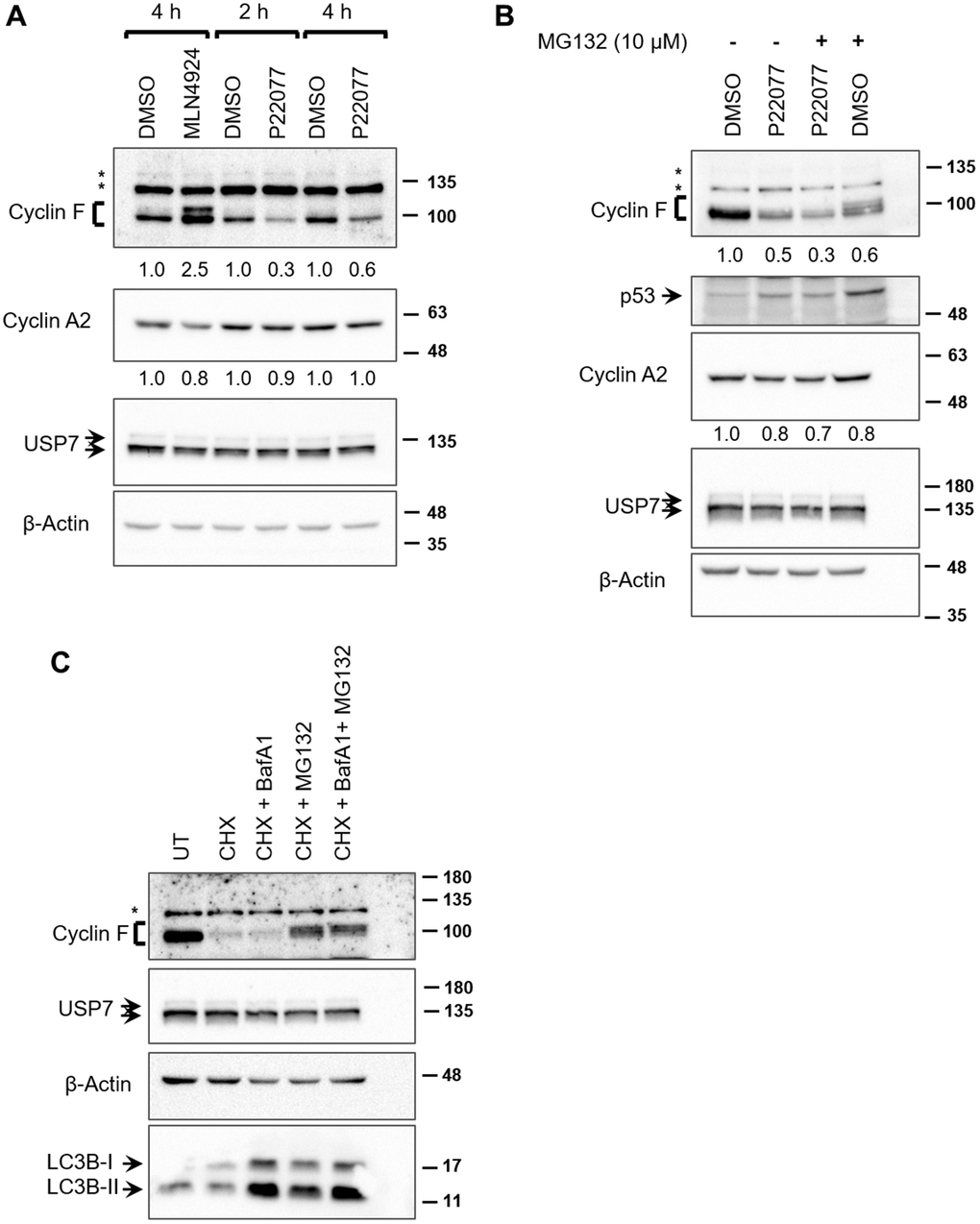 Antibodies to cyclin F (D9K2U), USP7 (D17C6), UBR5 (D6O8z), LC3 (4775S), and β-Actin (13E5) were from Cell Signaling Technology (MA, USA). Anti-HA-probe (F7) was from Santa Cruz (TX, USA), anti-cyclin A2 (BF683) from Bethyl Laboratories (TX, USA), anti-p53 (DO7) from Abcam (Cambridge, UK), anti-rabbit and anti-mouse IgG-HRP from Genei Laboratories (Bangalore, India), and anti-rabbit IgG-HRP from Cloud-Clone Corp (TX, USA).